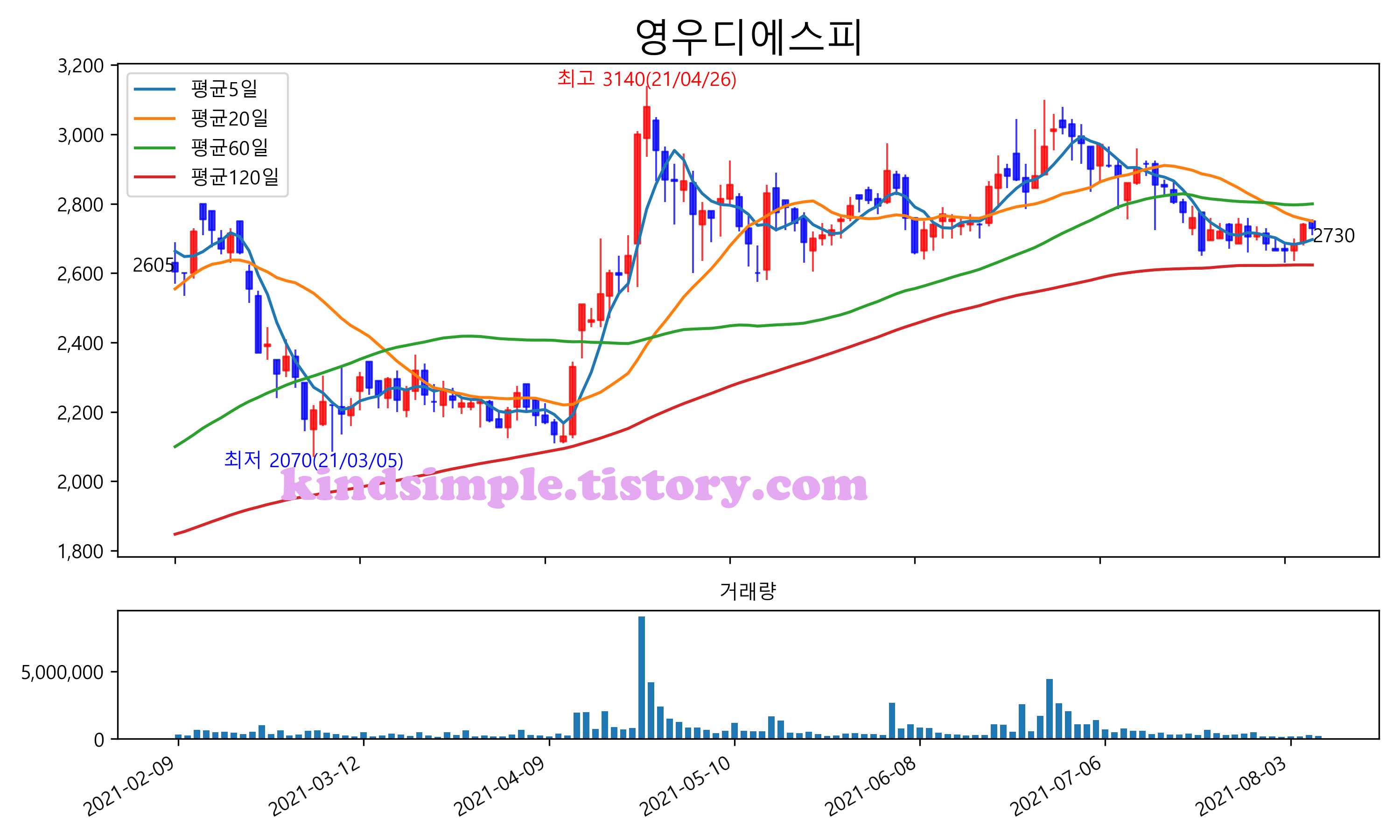 최근 6개월간 캔들차트 및 이동평균선입니다.
