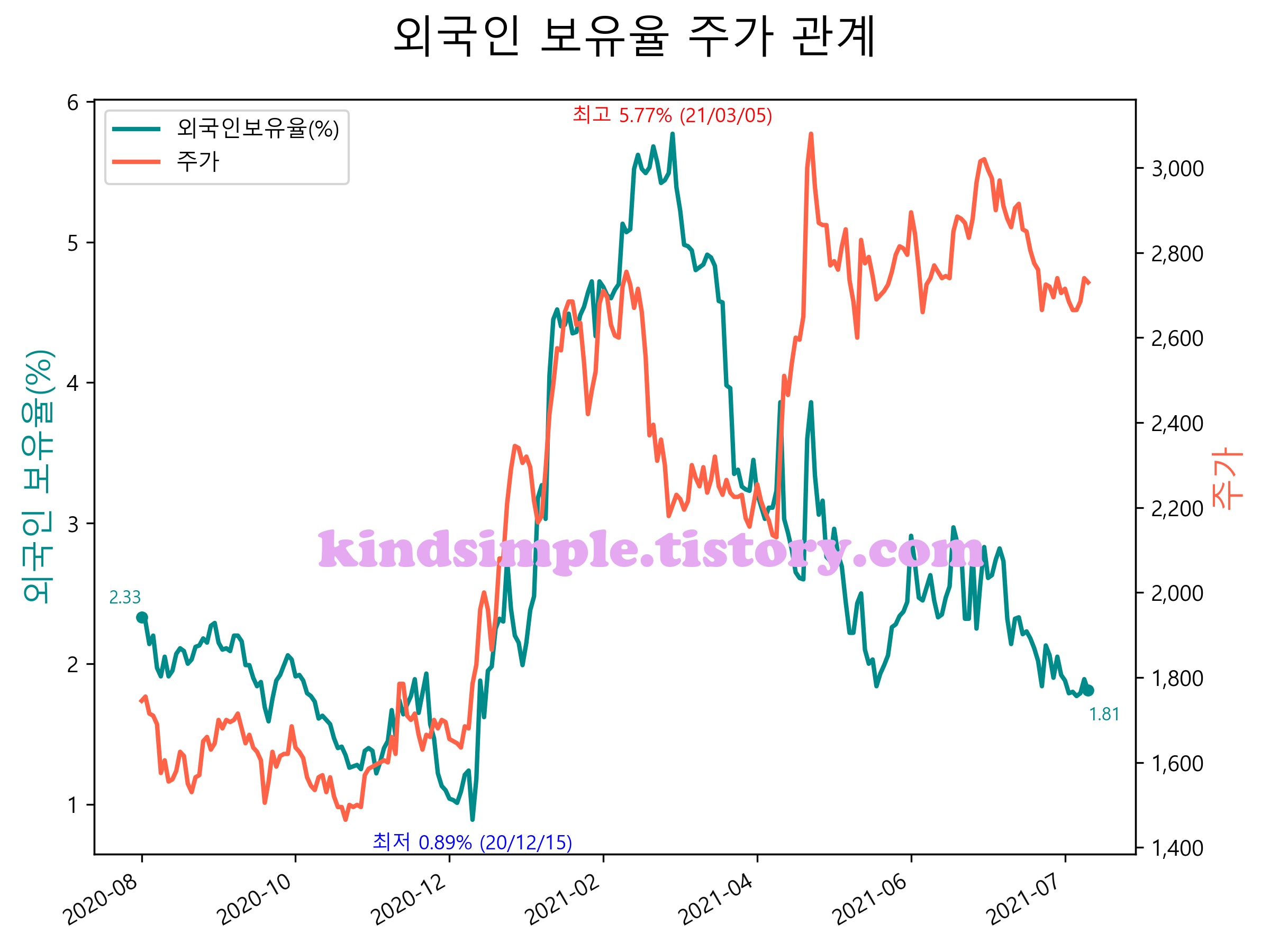 최근 1년간 외국인 보유율 및 주가와의 관계입니다.