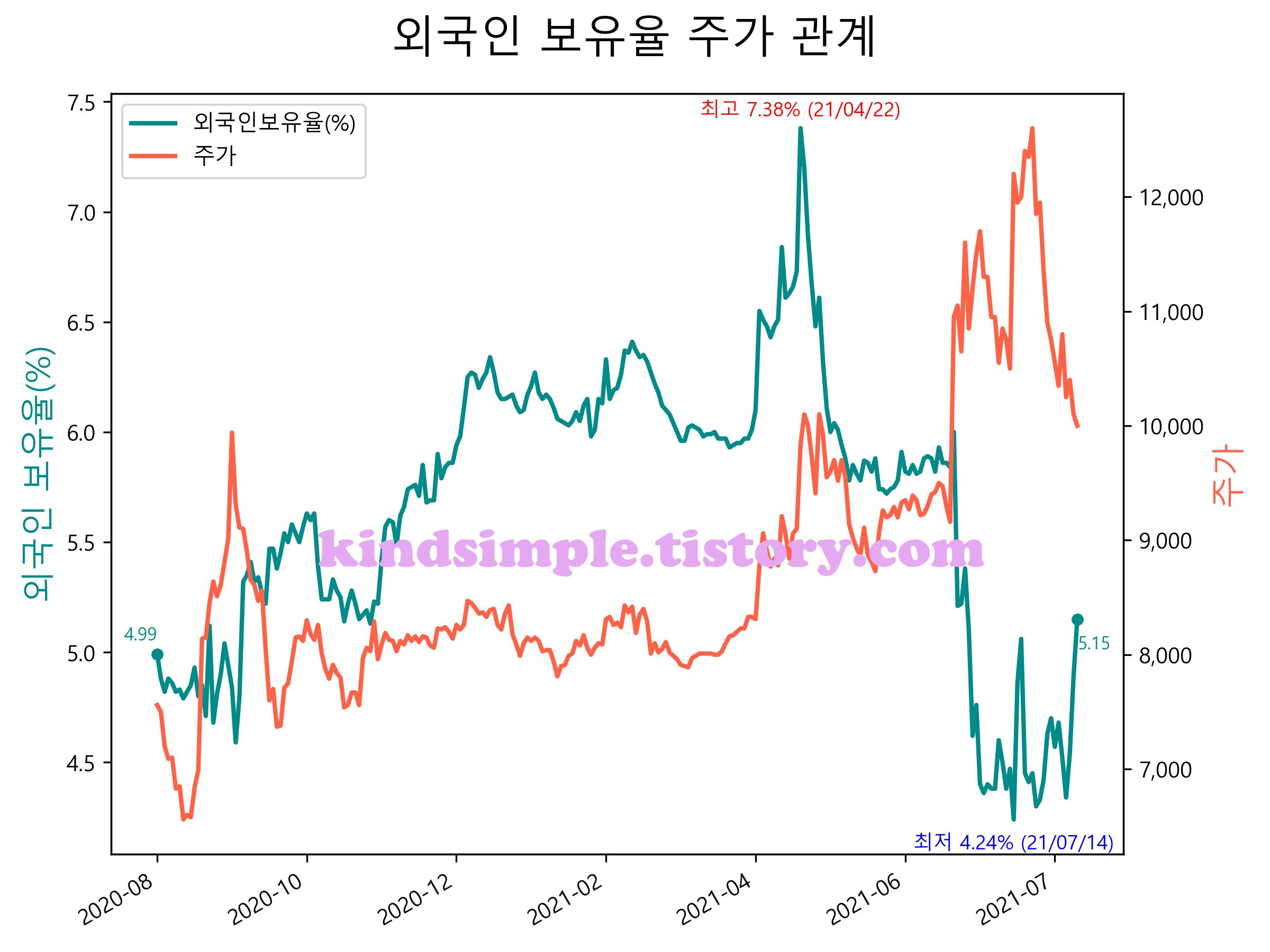 최근 1년간 외국인 보유율 및 주가와의 관계입니다.
