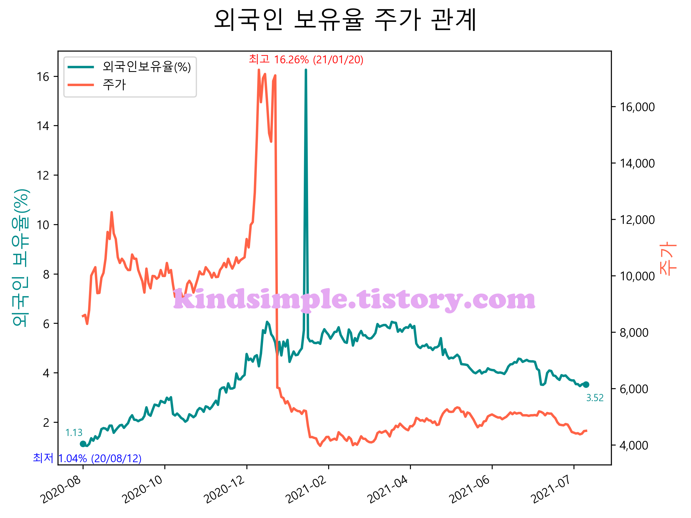 최근 1년간 외국인 보유율 및 주가와의 관계입니다.