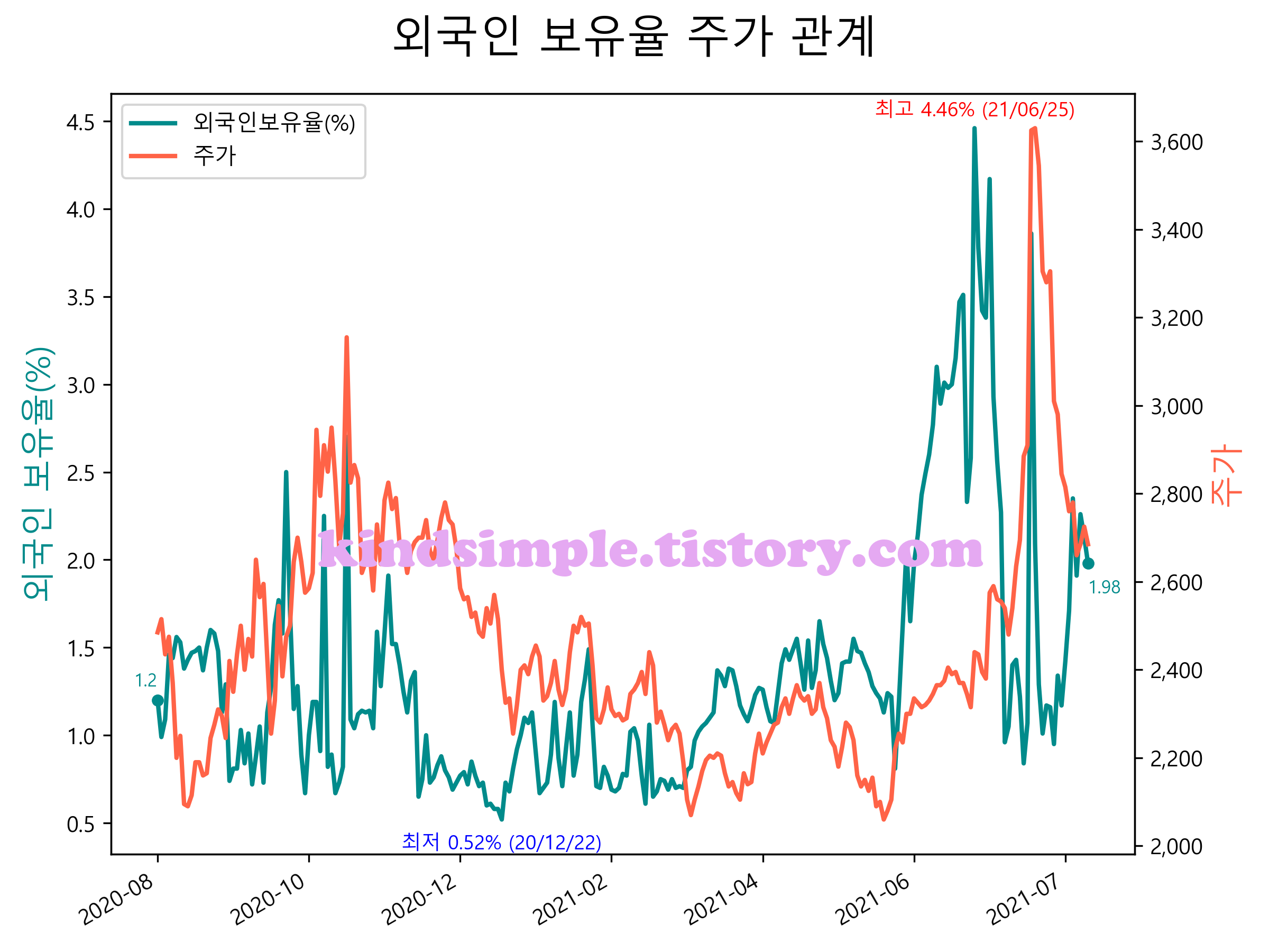 최근 1년간 외국인 보유율 및 주가와의 관계입니다.