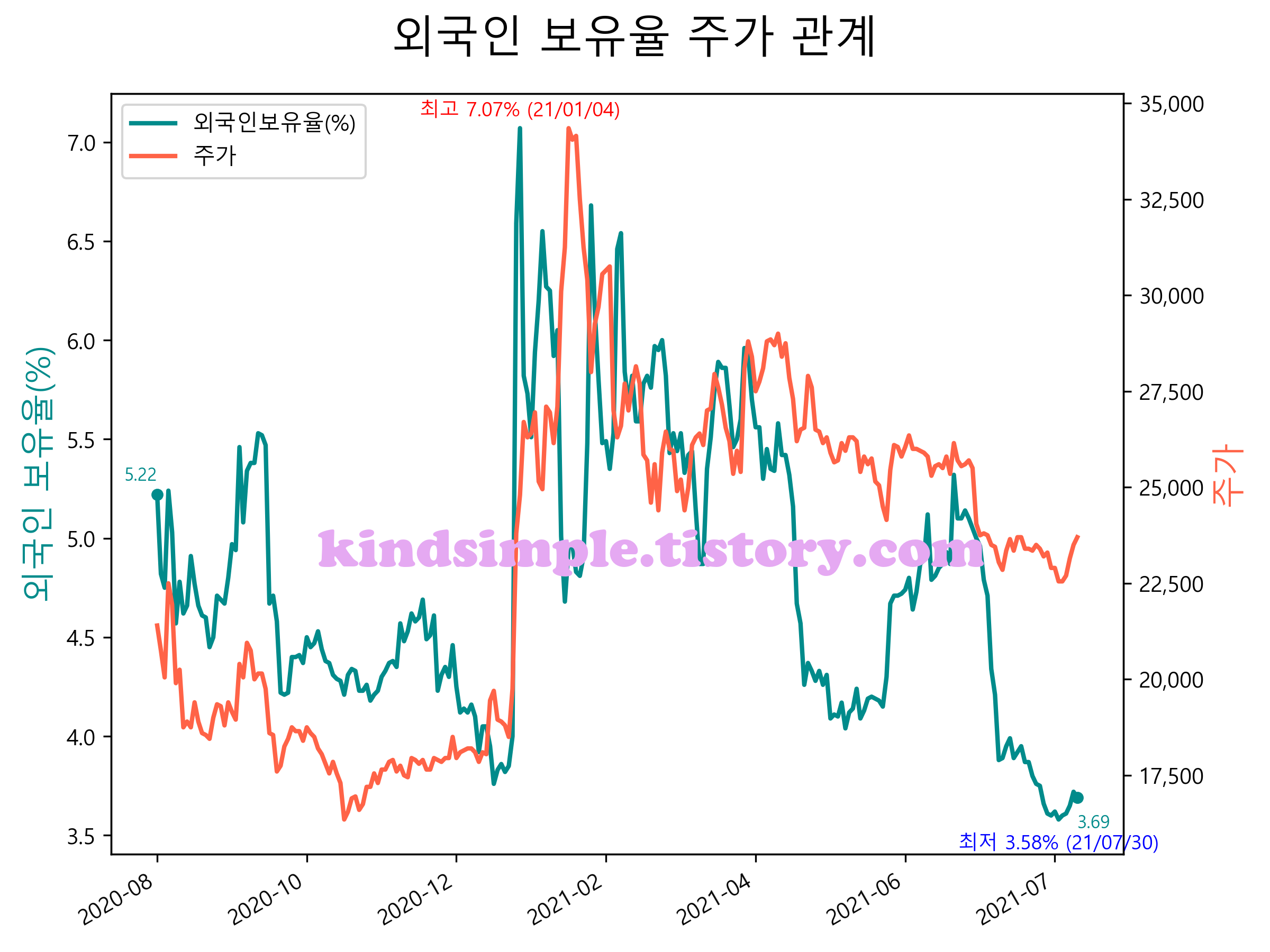 최근 1년간 외국인 보유율 및 주가와의 관계입니다.