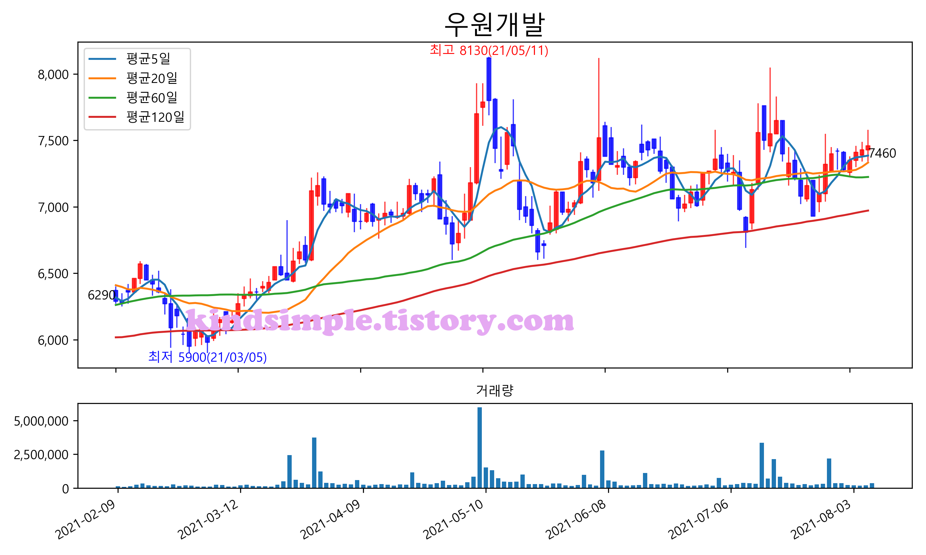 최근 6개월간 캔들차트 및 이동평균선입니다.