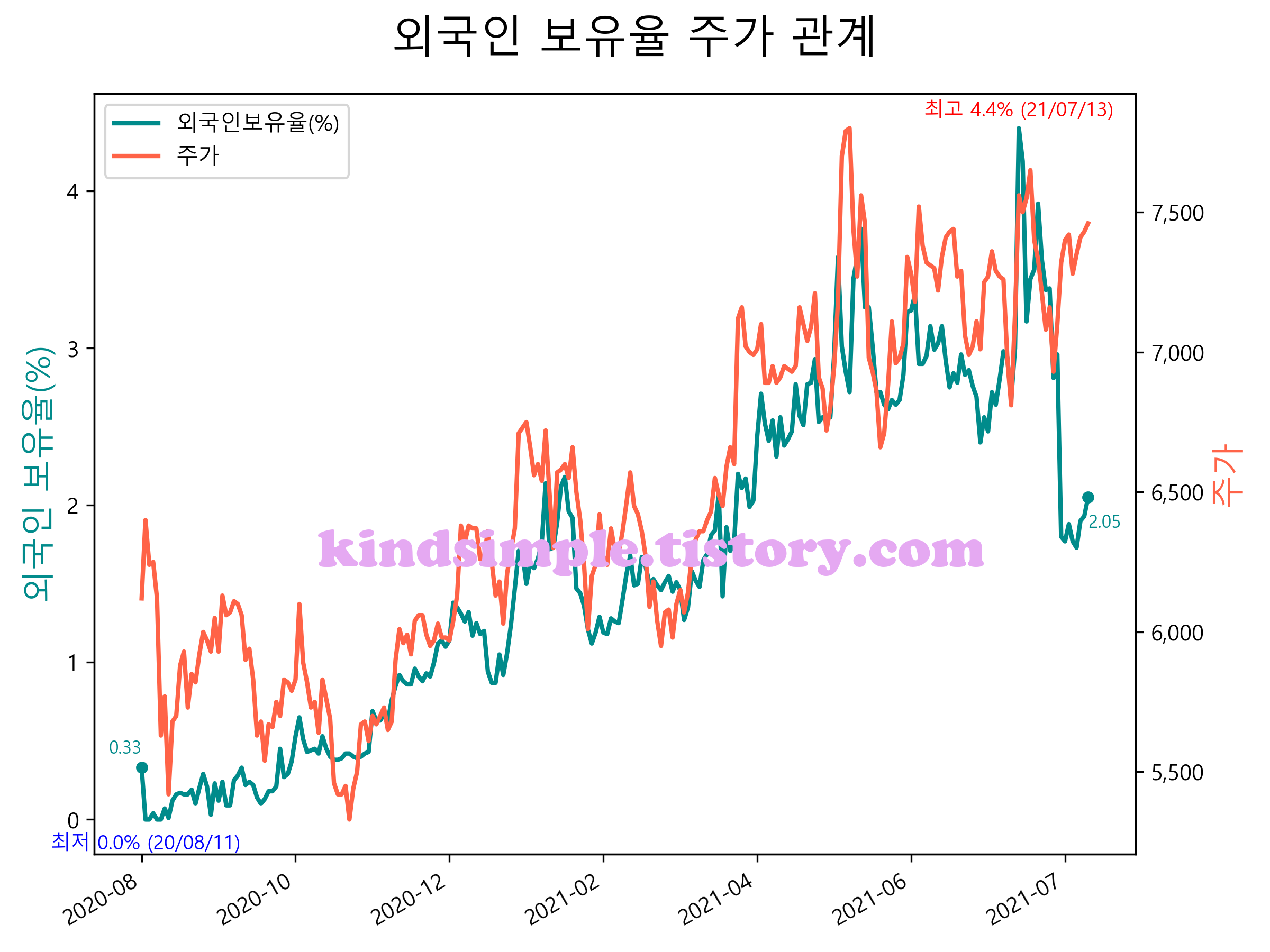 최근 1년간 외국인 보유율 및 주가와의 관계입니다.
