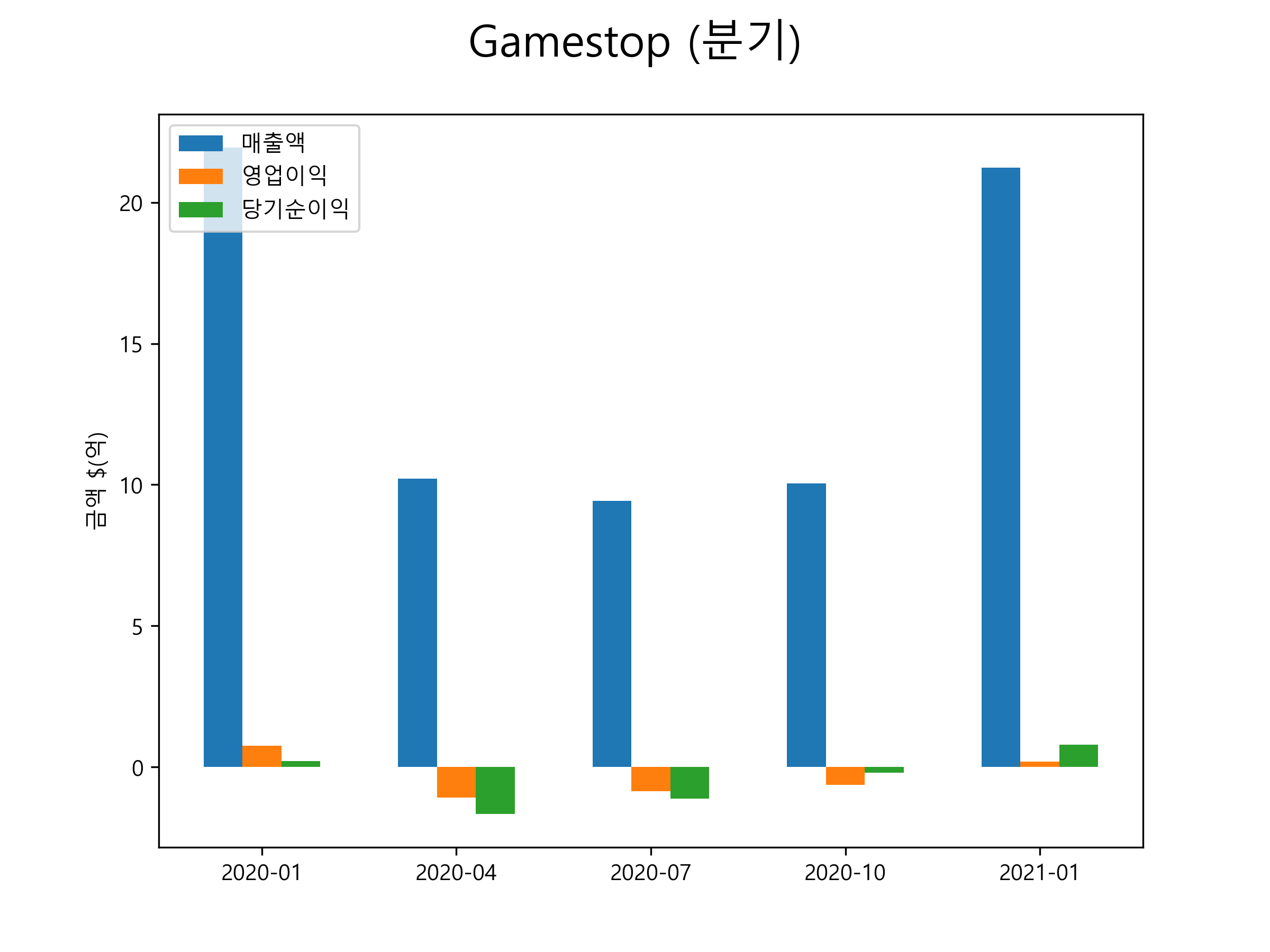 게임스탑의 2021년 4분기 매출은 21.22억달러, 영업이익 0.19억달러, 당기순이익 0.8억달러을 기록했습니다. 분기별 매출 및 영업이익, 당기순이익 표입니다.