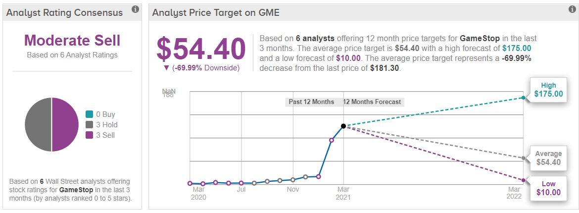 게임스탑의 미국 투자자들의 투자의견입니다. 지난 3개월 동안 총 6명의 애널리스트가 목표가를 추정하였습니다. 목표주가는 $54.40로 현재주가 $181.30보다 -69.99% 하락할 것으로 전망했습니다. 가장 높은 목표주가는 $175.00이며, 가장 낮은 목표주가는 $10.00입니다.