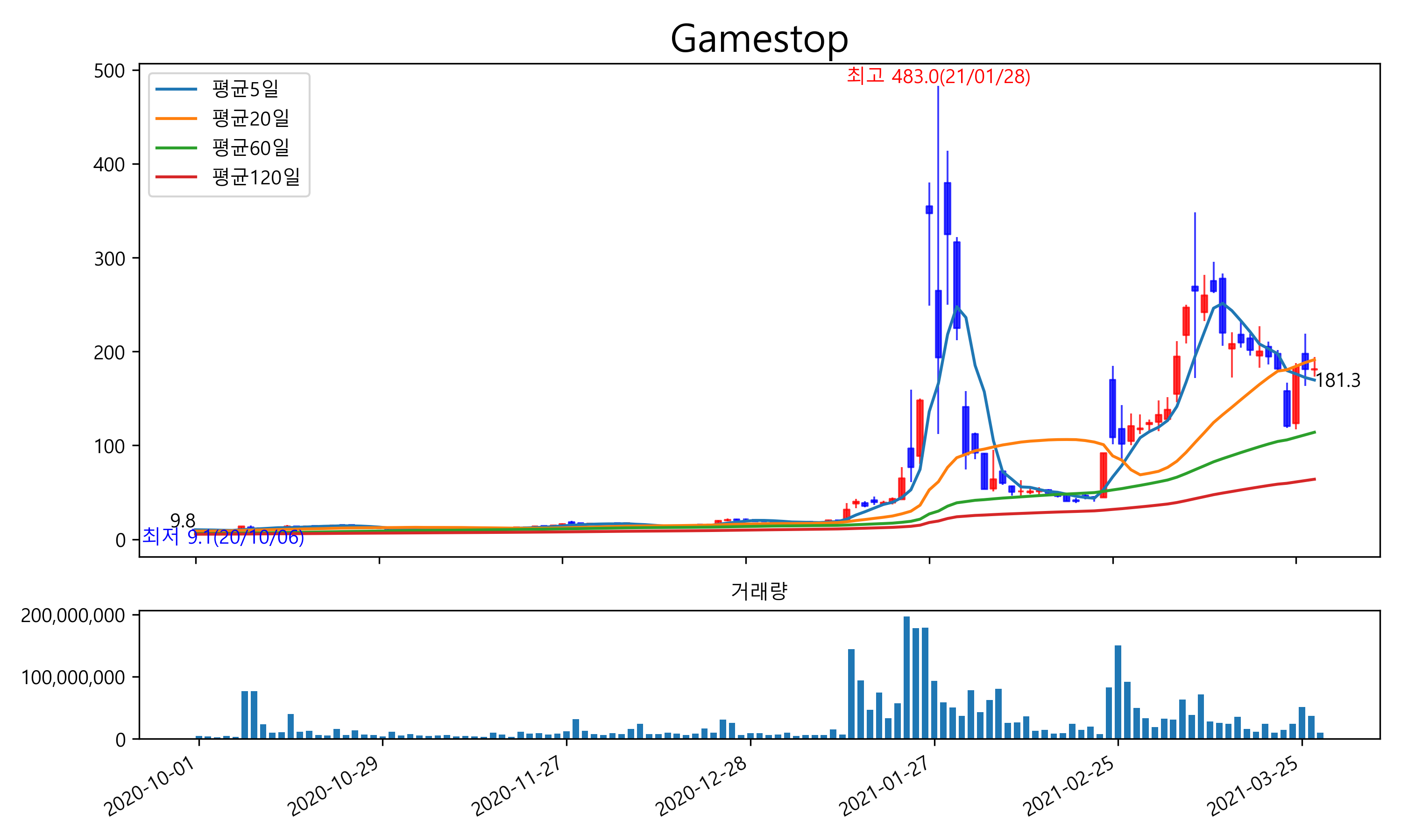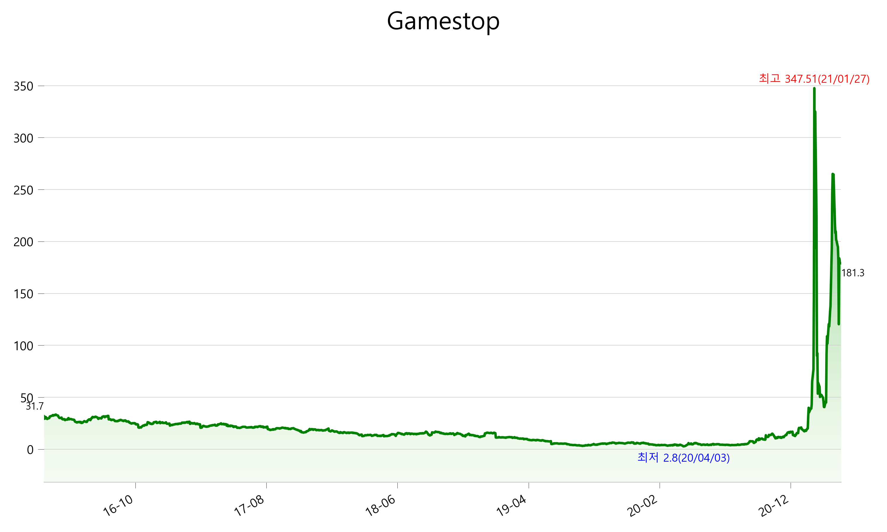 게임스탑은 한때 공매도세력과 이를 저지하려는 개미들에 의해 주가가 요동쳤습니다. 한때 주가는 483달러까지 치솟았다가 다시 급감한뒤 다시 한차례 치고 올랐다가 다시 주춤한 상태입니다.