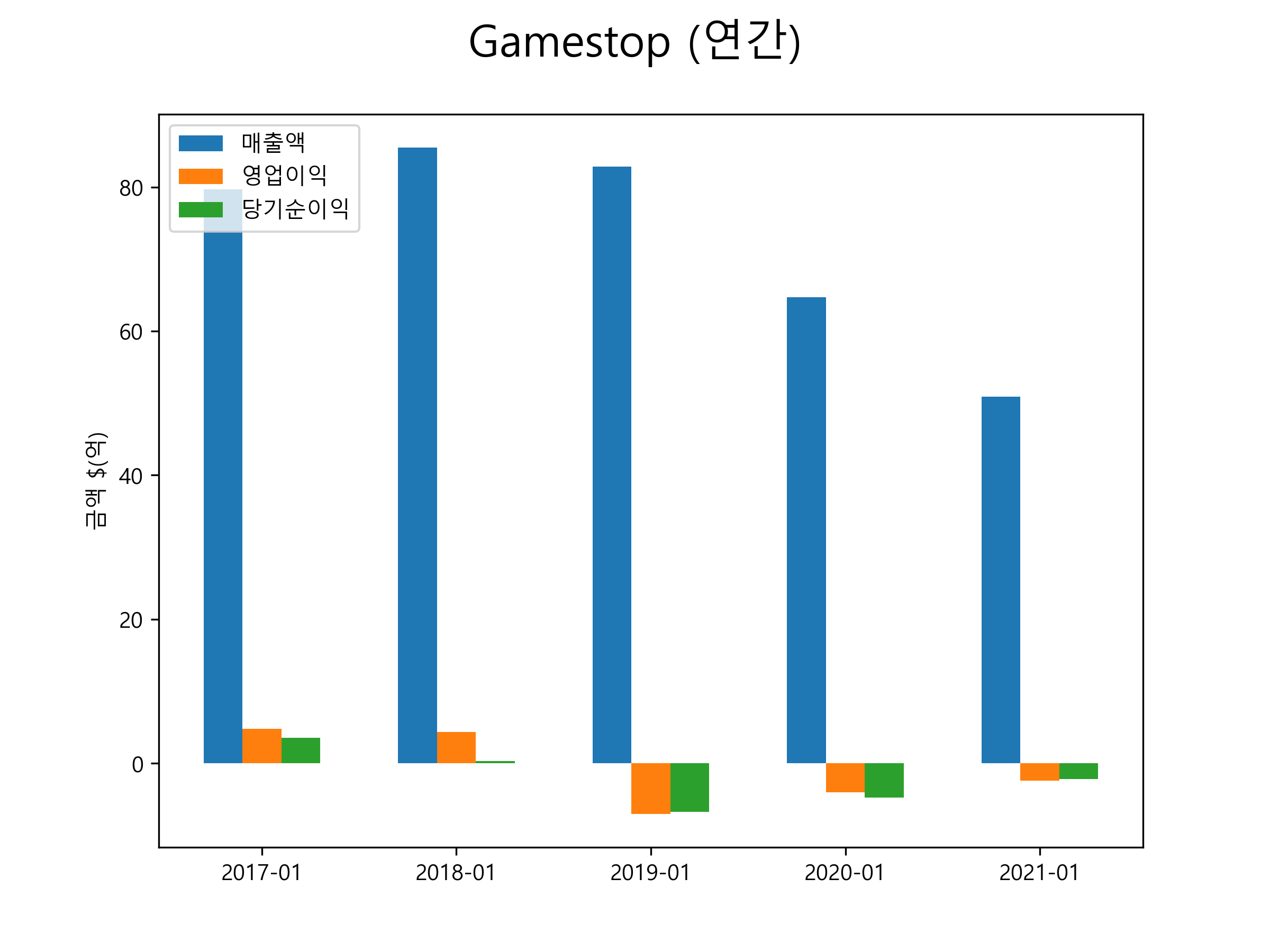 게임스탑의 2021년 매출은 50.9억달러, 영업손실 -2.38억달러, 당기순손실 -2.15억달러을 기록했습니다. 연간별 매출 및 영업이익, 당기순이익 표입니다.