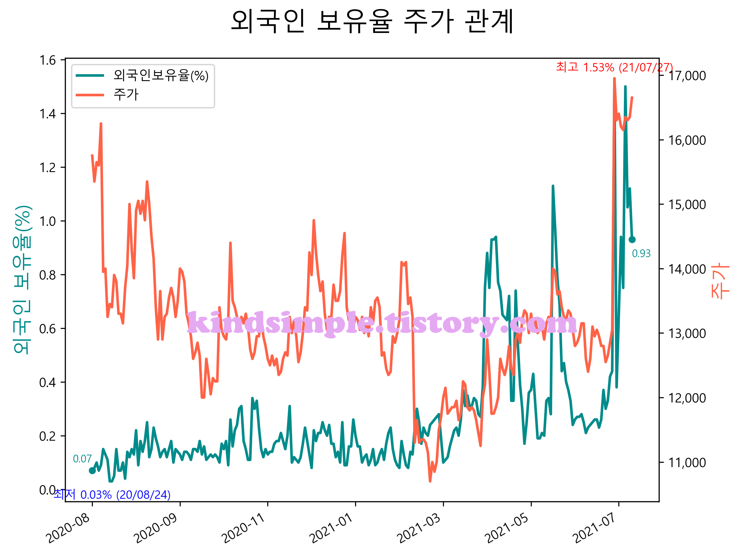 최근 1년간 외국인 보유율 및 주가와의 관계입니다.