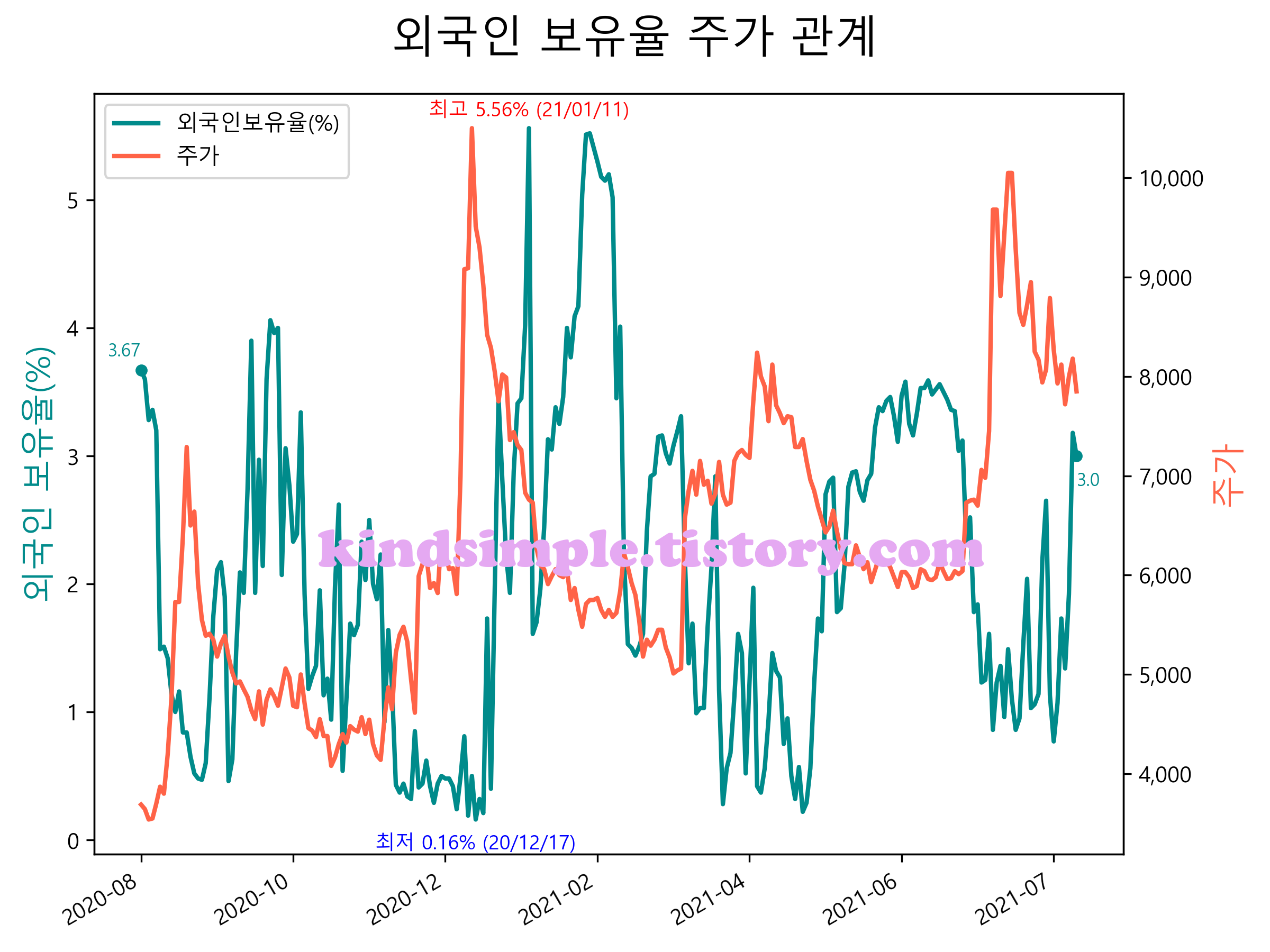 최근 1년간 외국인 보유율 및 주가와의 관계입니다.