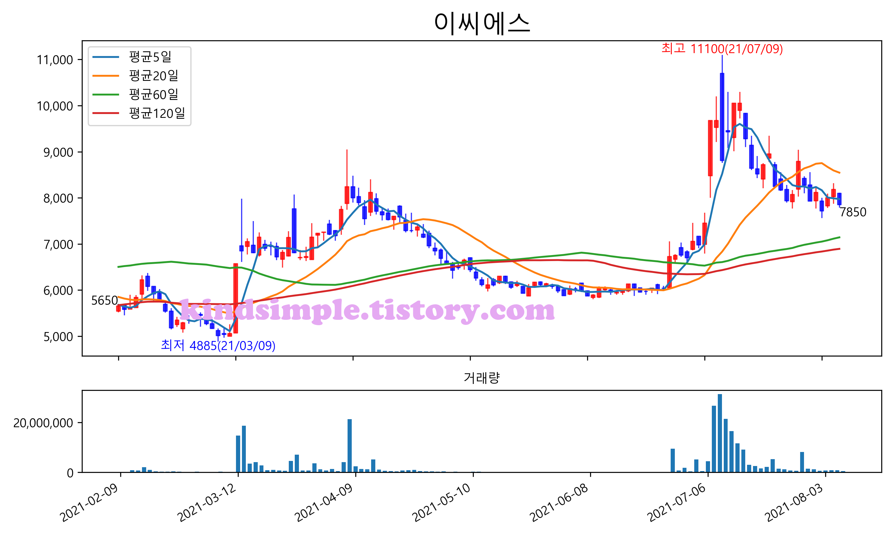 최근 6개월간 캔들차트 및 이동평균선입니다.