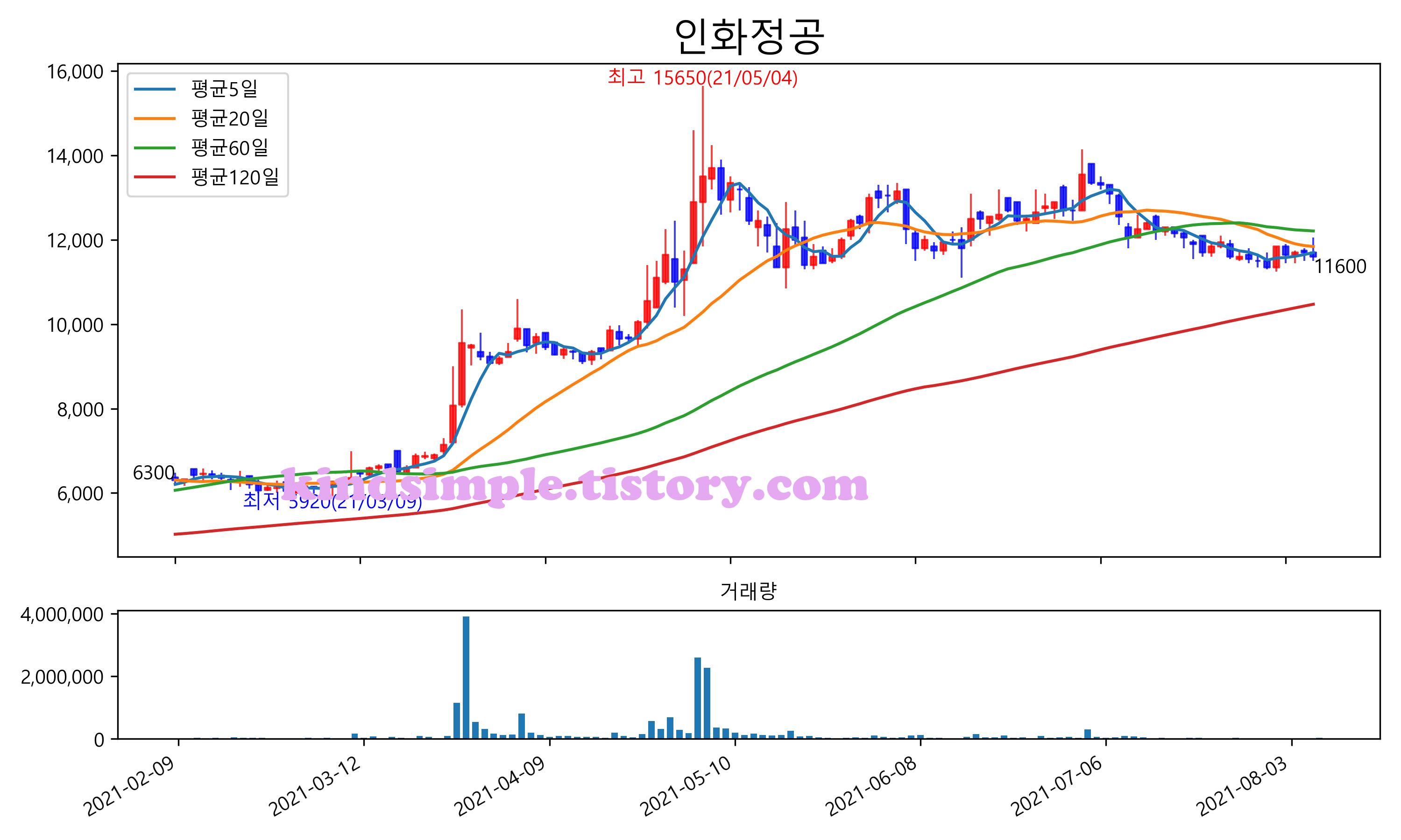 최근 6개월간 캔들차트 및 이동평균선입니다.