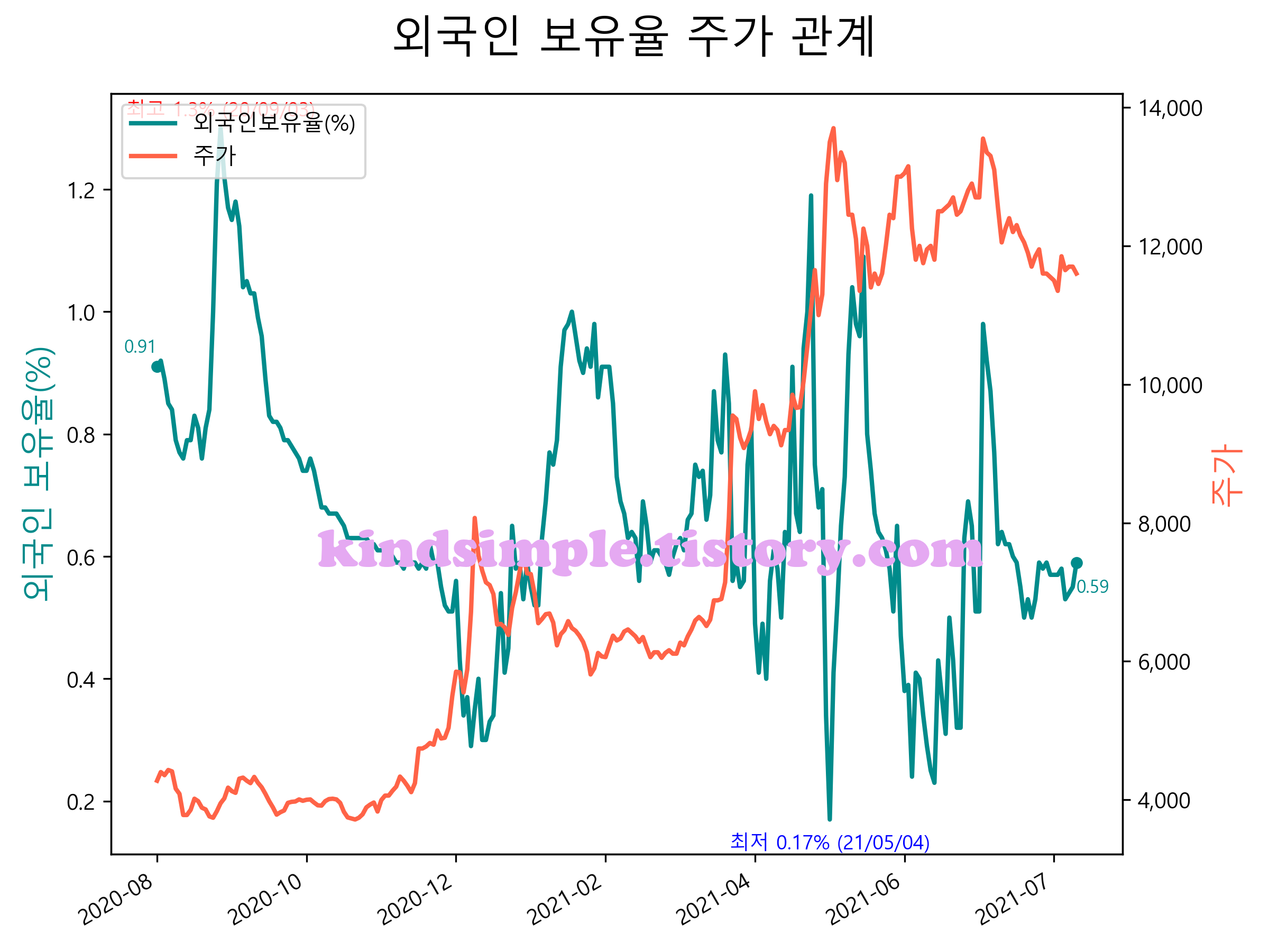 최근 1년간 외국인 보유율 및 주가와의 관계입니다.
