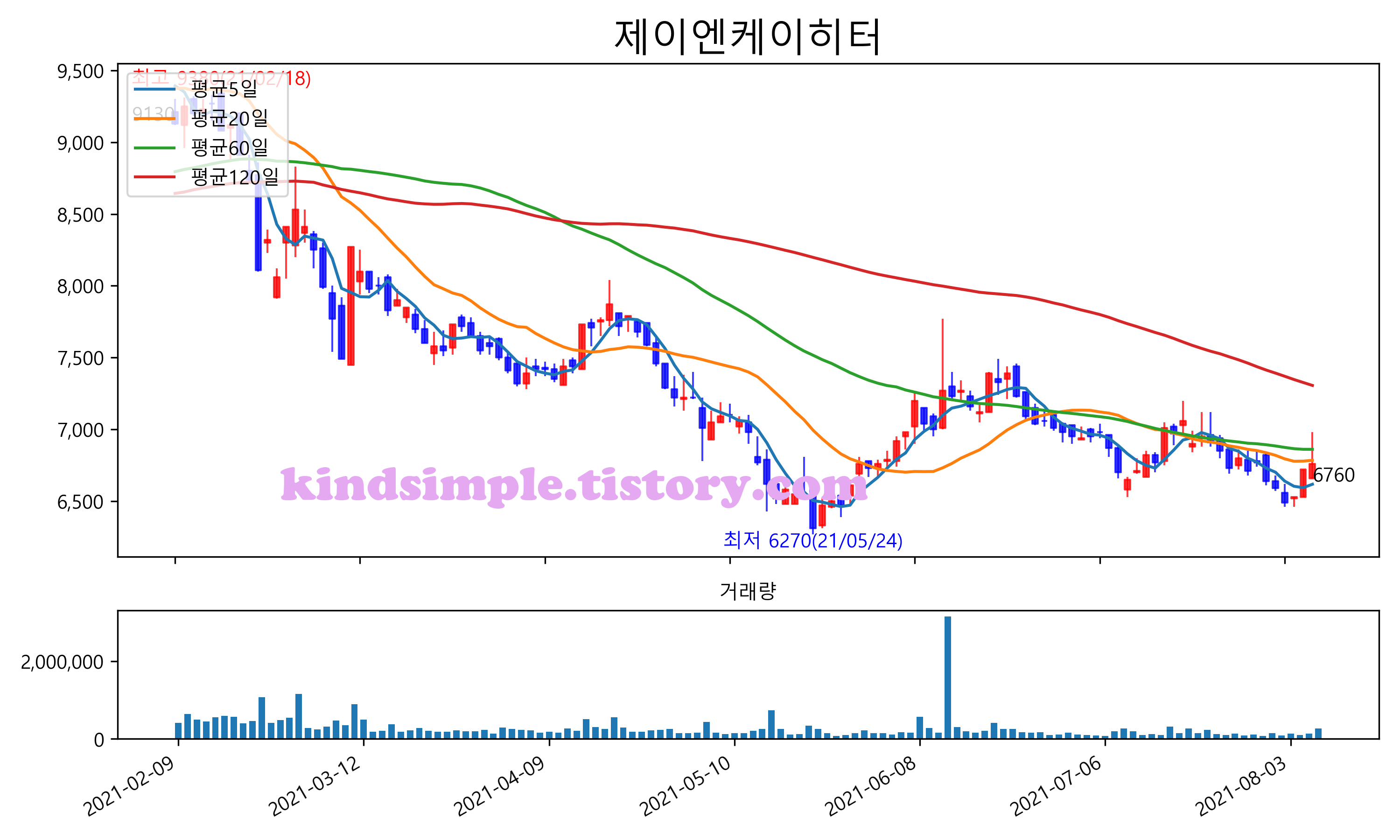 최근 6개월간 캔들차트 및 이동평균선입니다.
