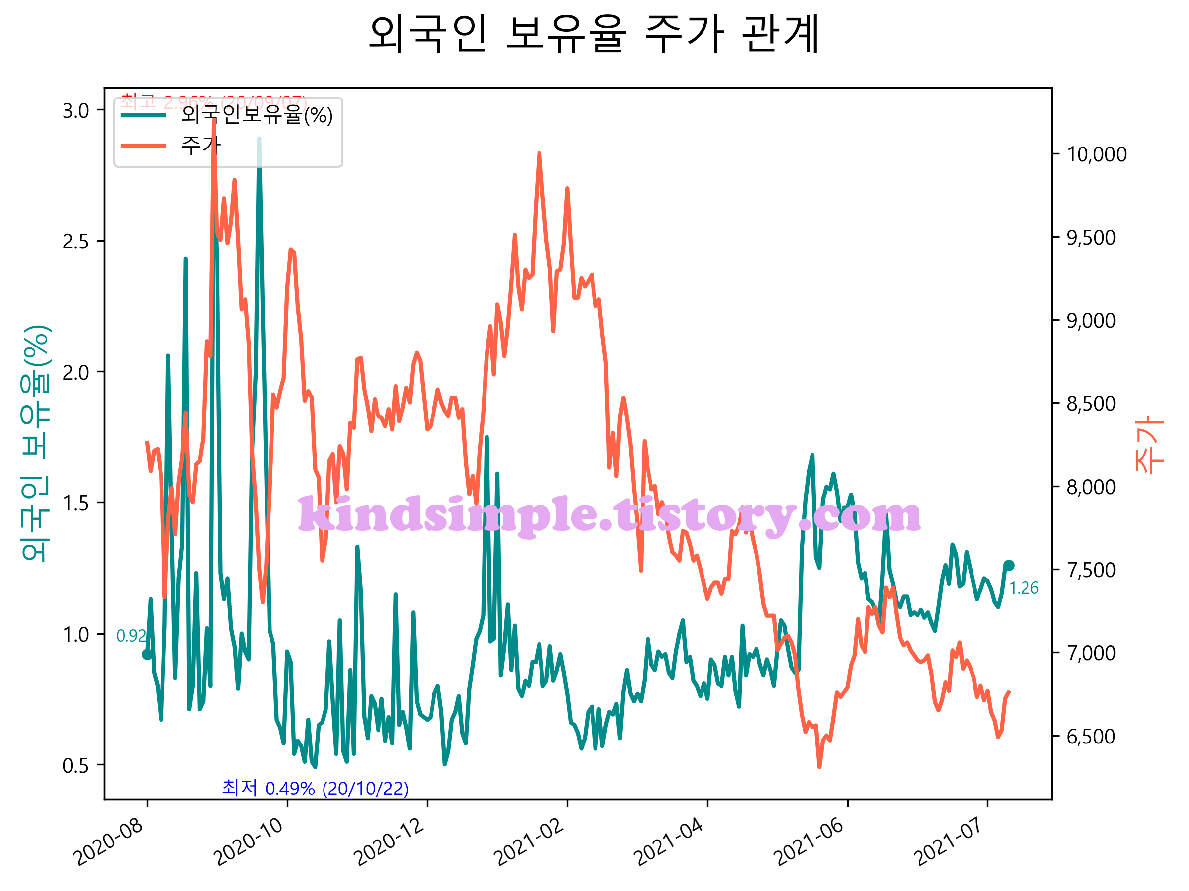 최근 1년간 외국인 보유율 및 주가와의 관계입니다.