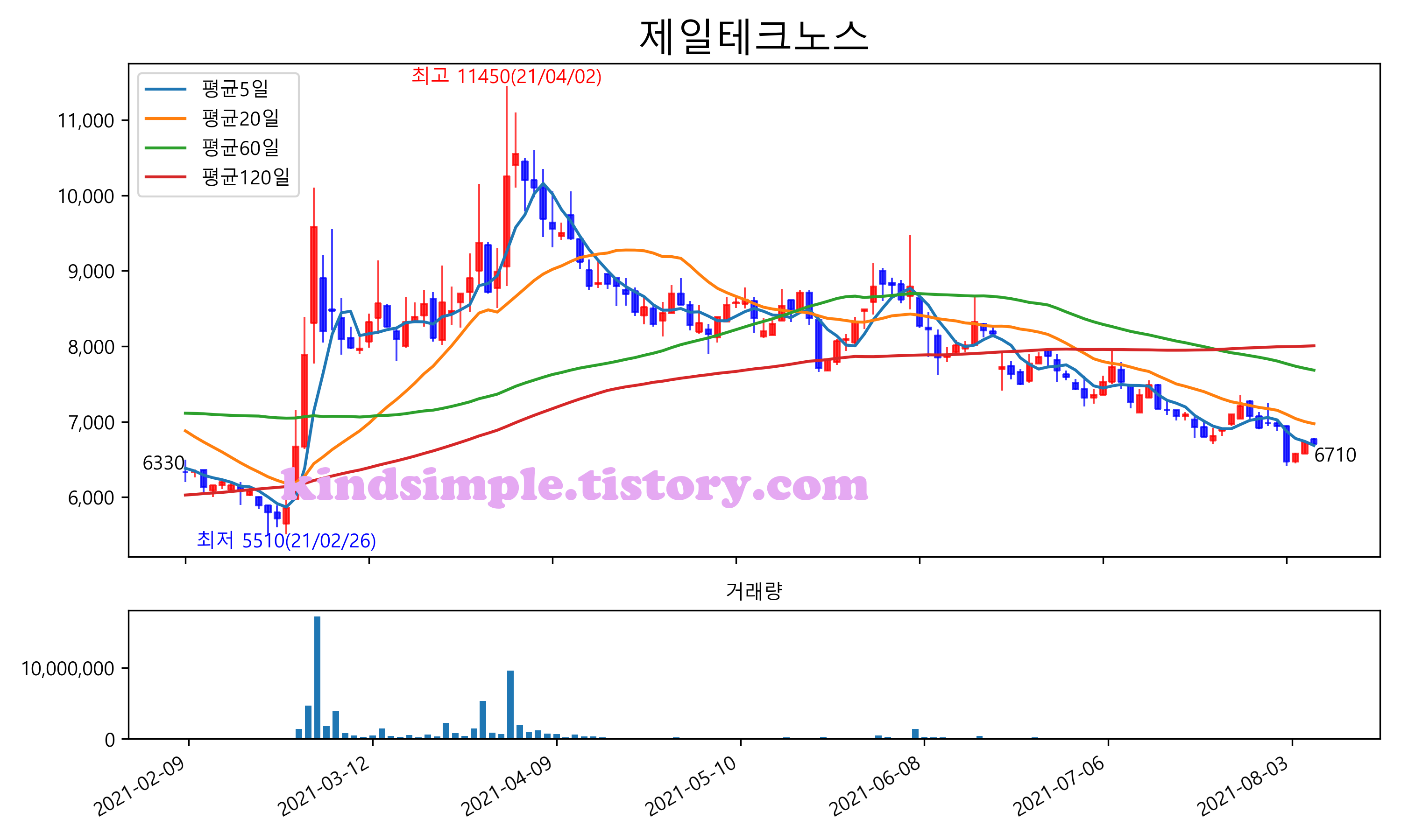 최근 6개월간 캔들차트 및 이동평균선입니다.