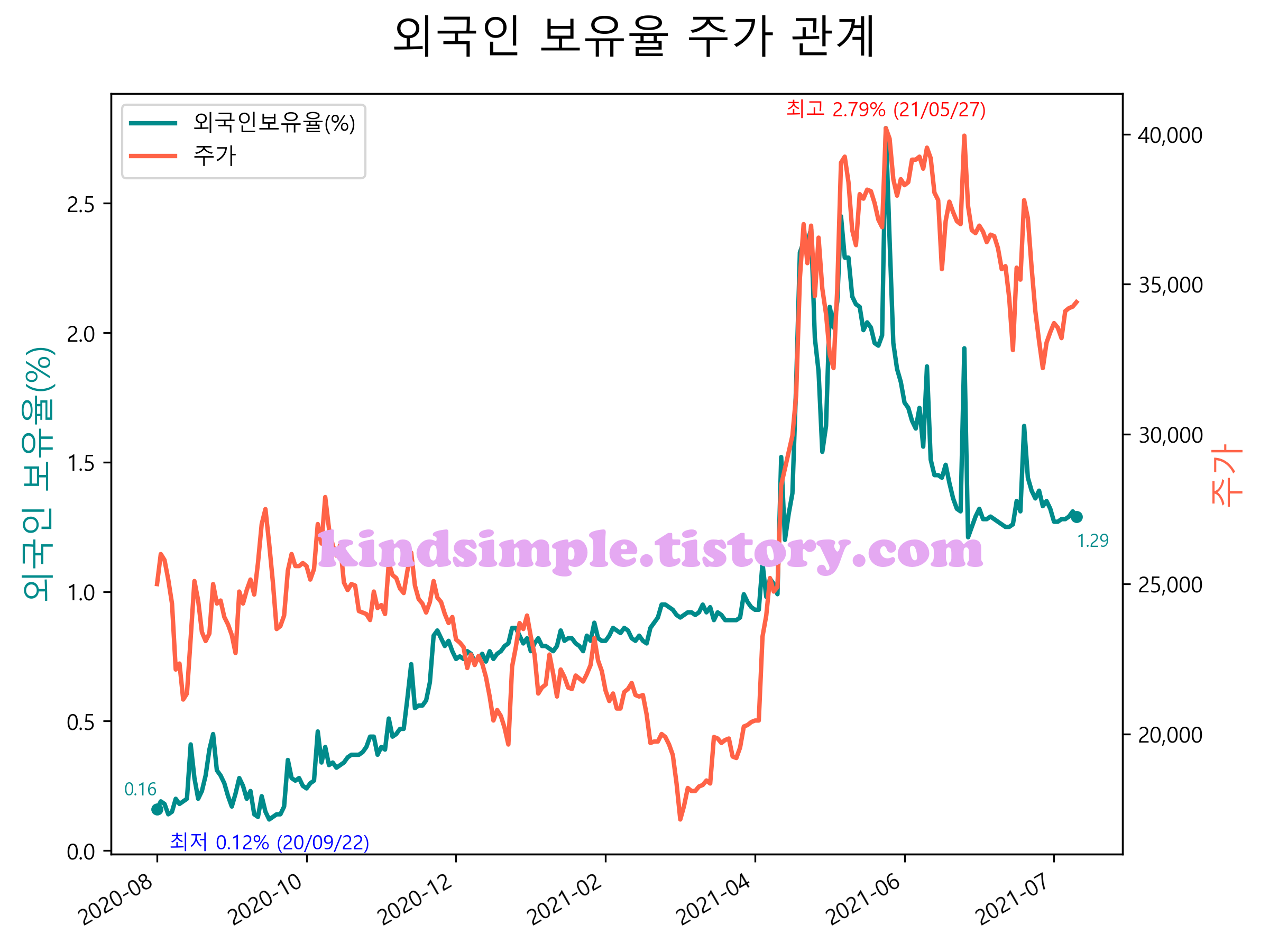 최근 1년간 외국인 보유율 및 주가와의 관계입니다.
