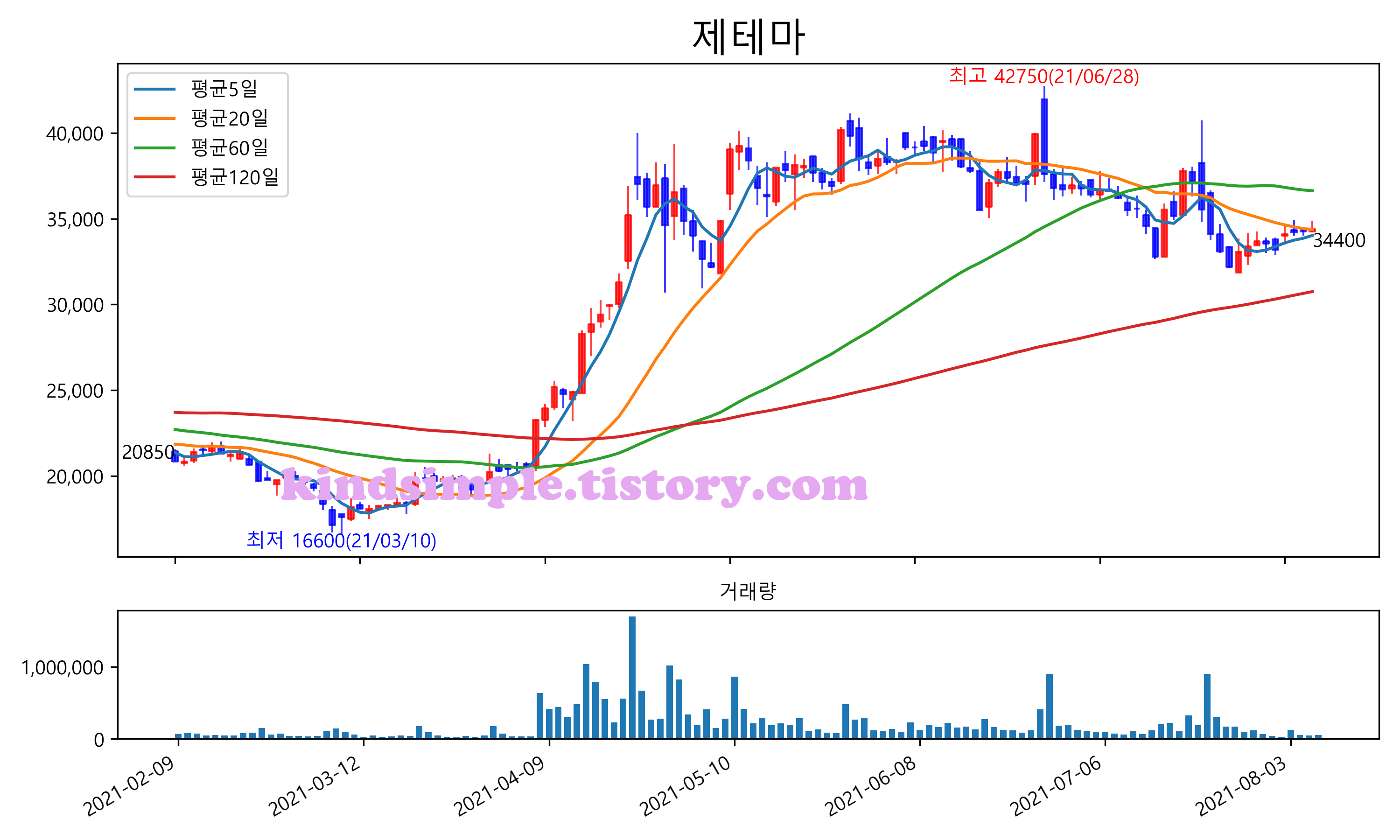 최근 6개월간 캔들차트 및 이동평균선입니다.