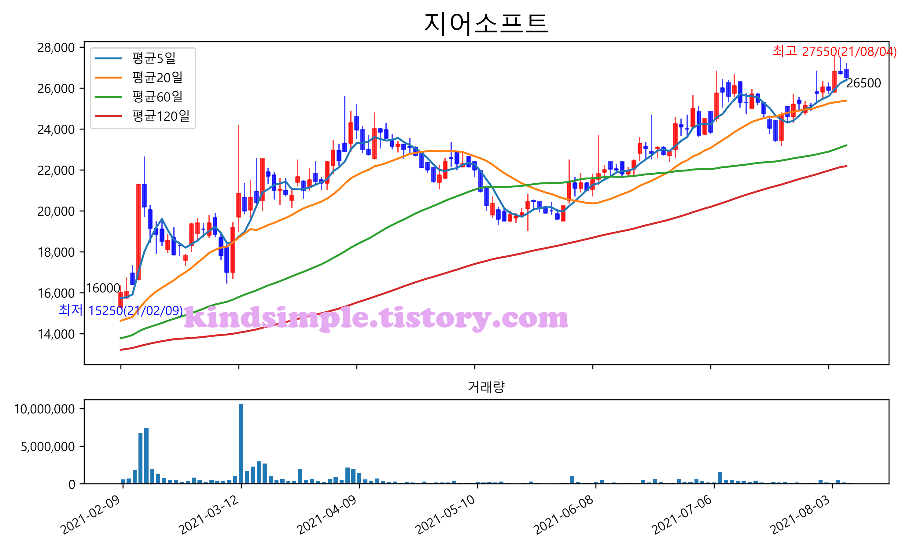 최근 6개월간 캔들차트 및 이동평균선입니다.
