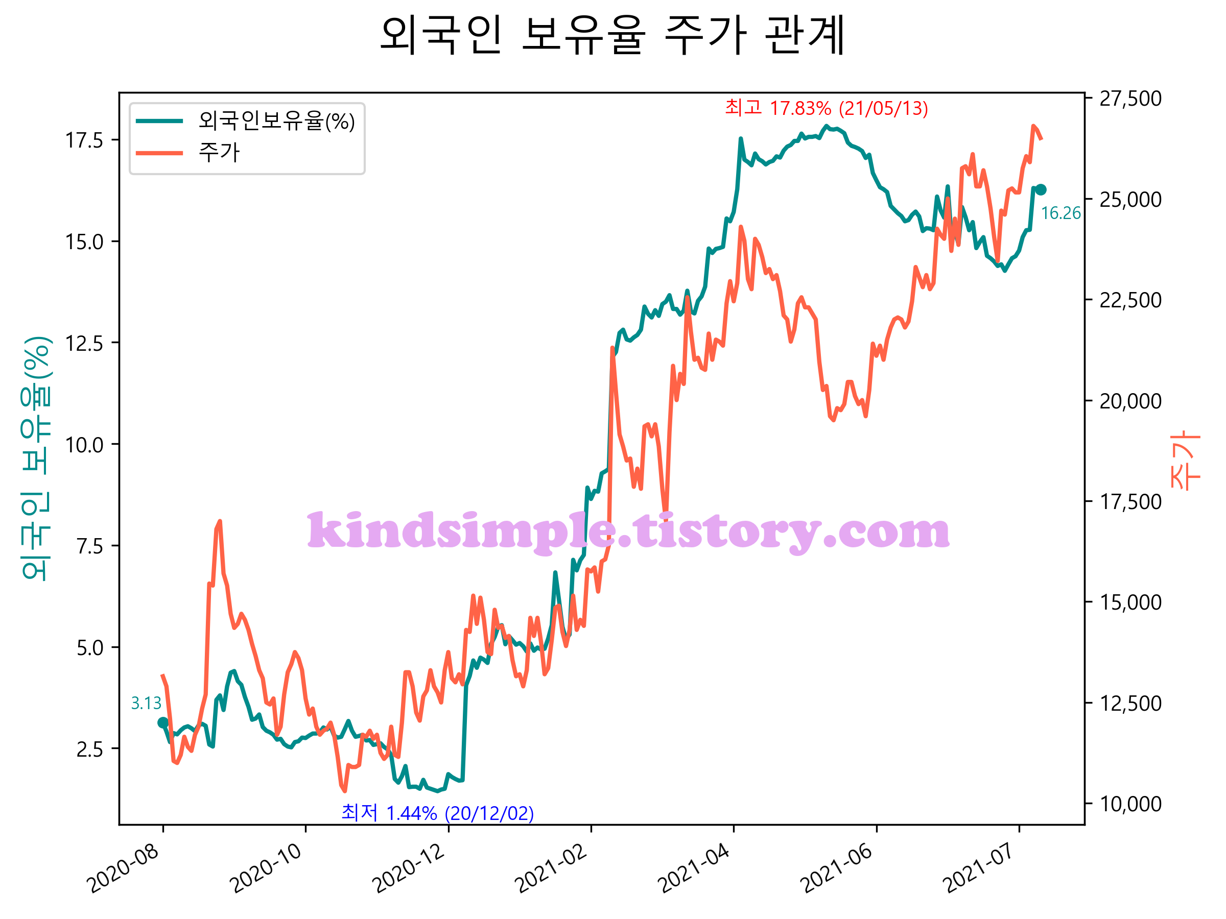 최근 1년간 외국인 보유율 및 주가와의 관계입니다.