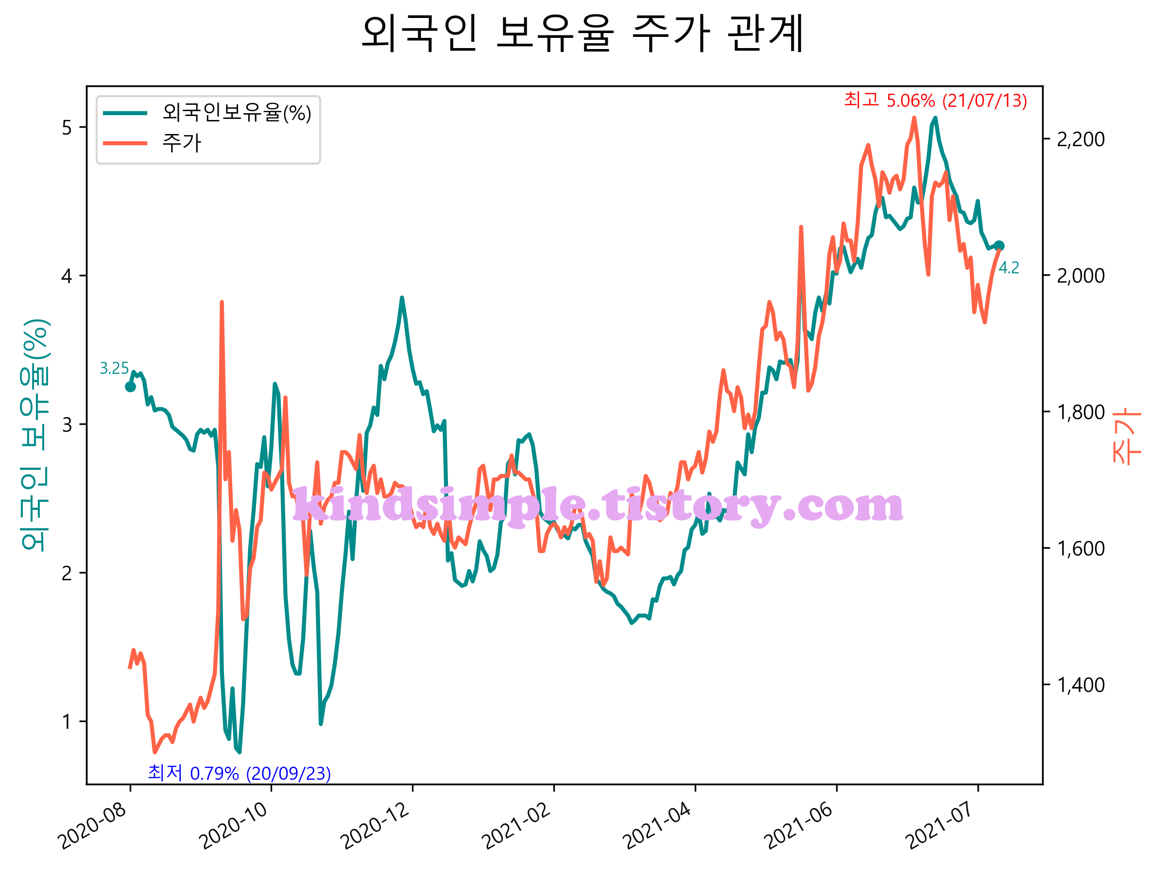 최근 1년간 외국인 보유율 및 주가와의 관계입니다.