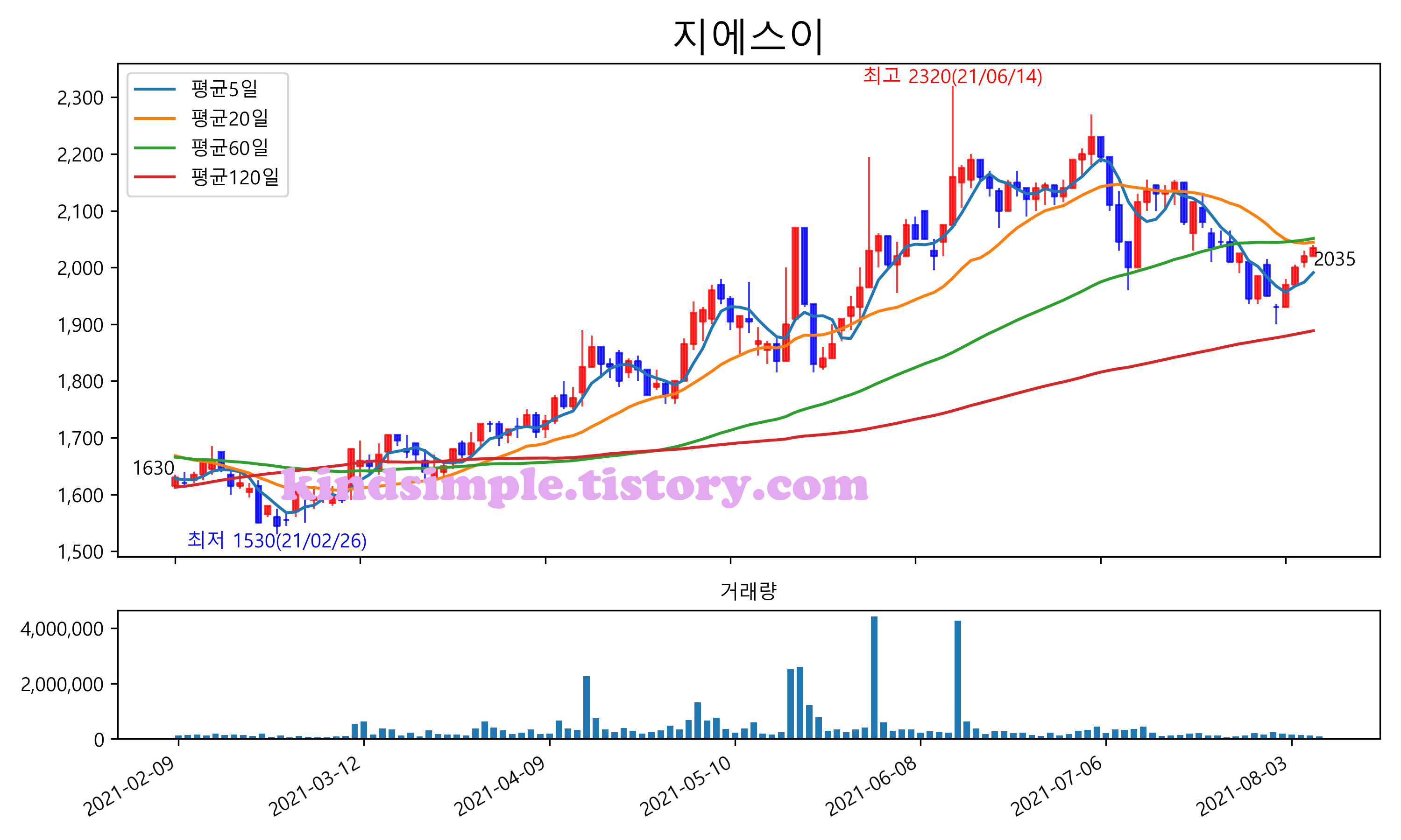 최근 6개월간 캔들차트 및 이동평균선입니다.
