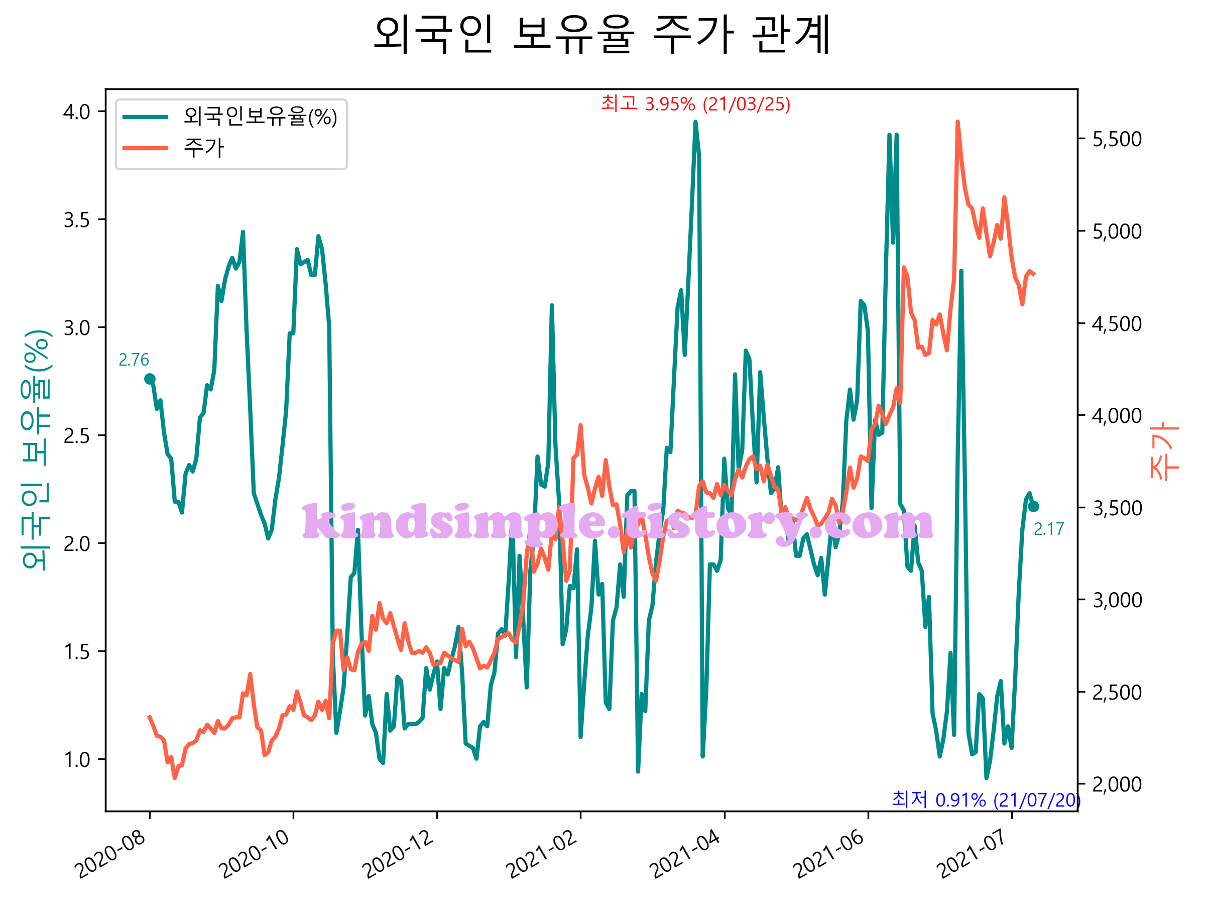 최근 1년간 외국인 보유율 및 주가와의 관계입니다.