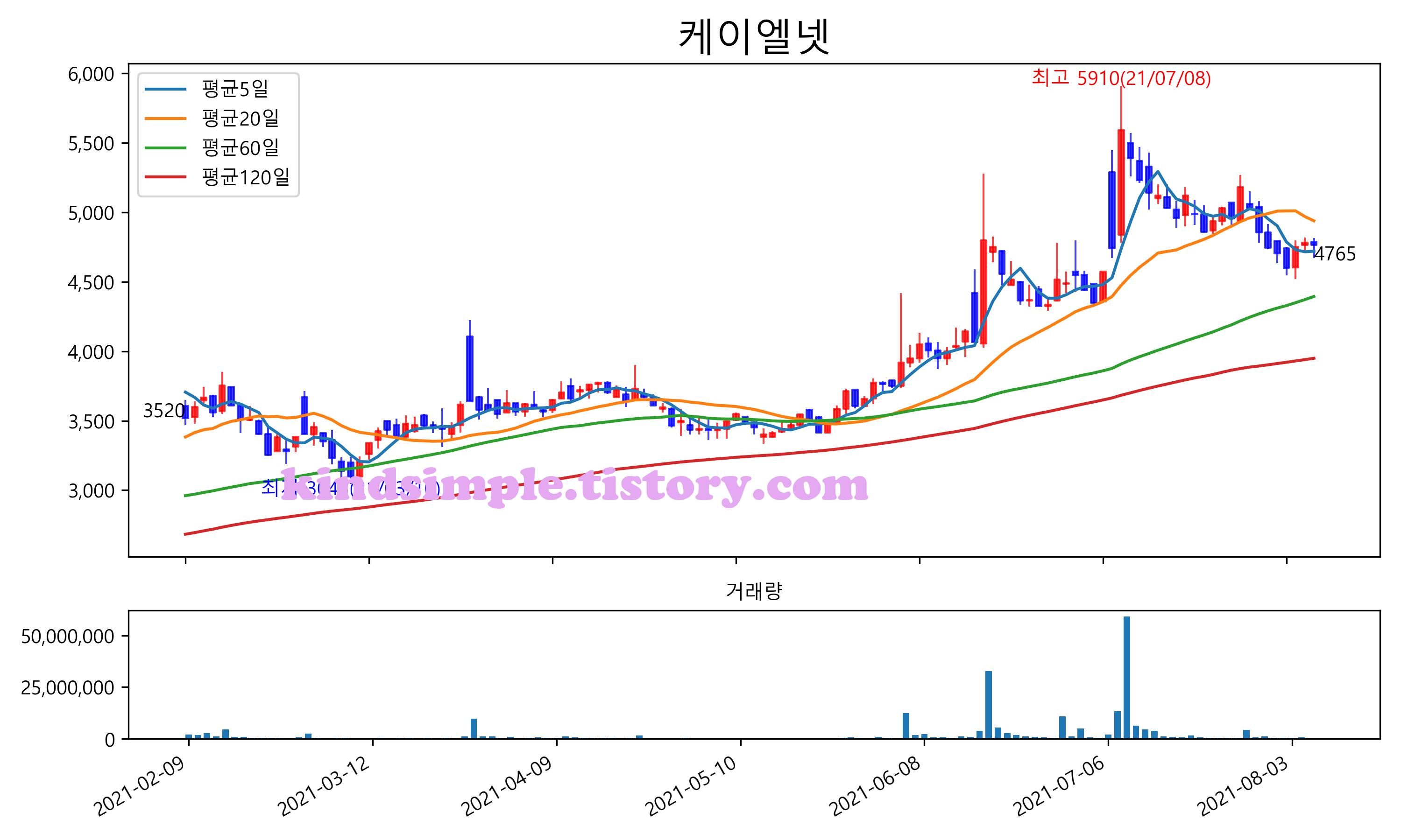 최근 6개월간 캔들차트 및 이동평균선입니다.