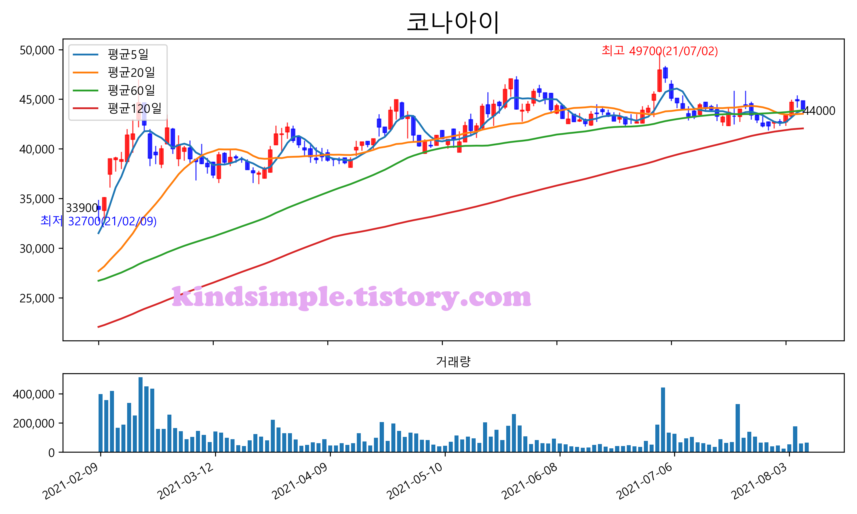 최근 6개월간 캔들차트 및 이동평균선입니다.