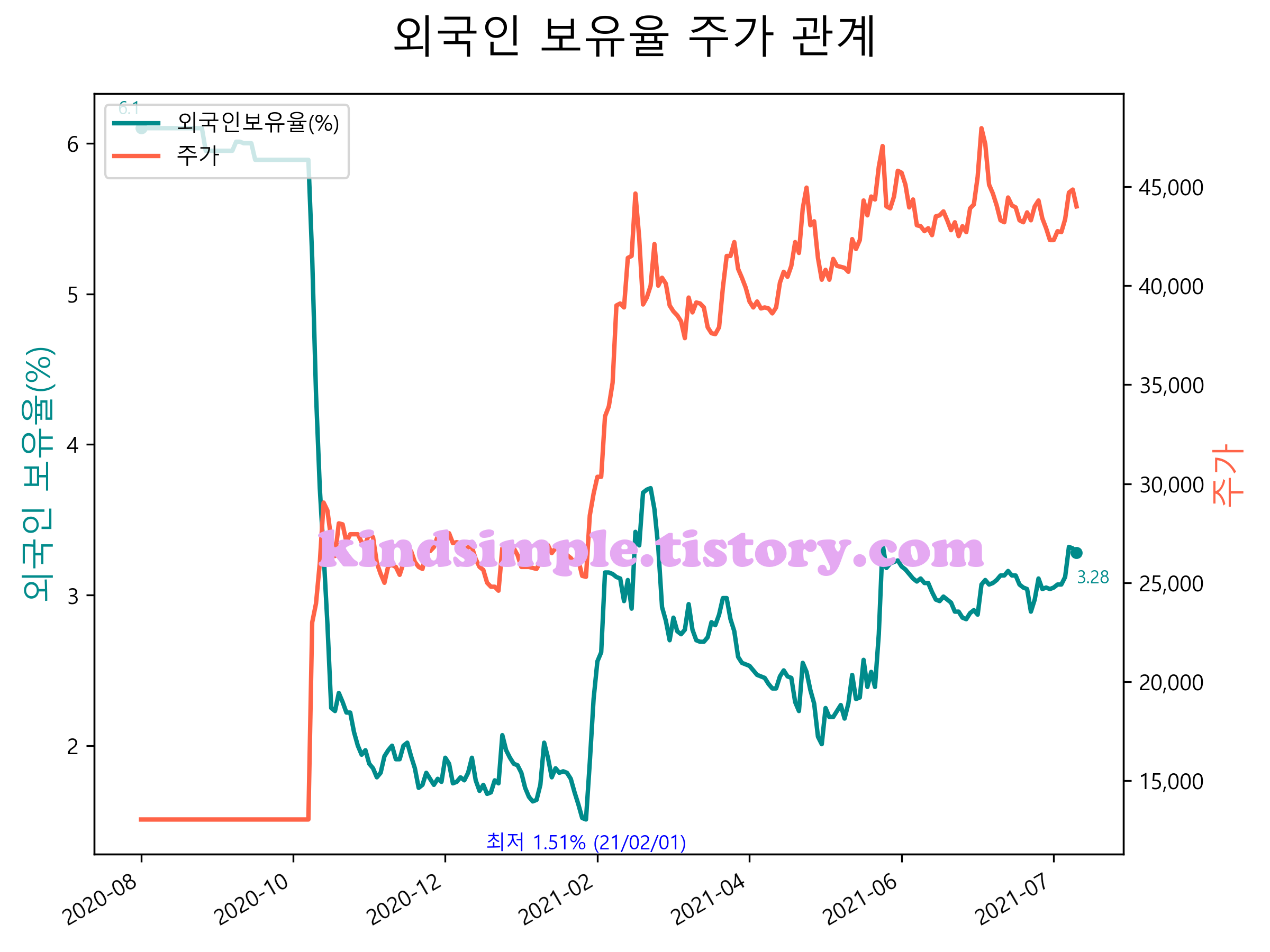 최근 1년간 외국인 보유율 및 주가와의 관계입니다.