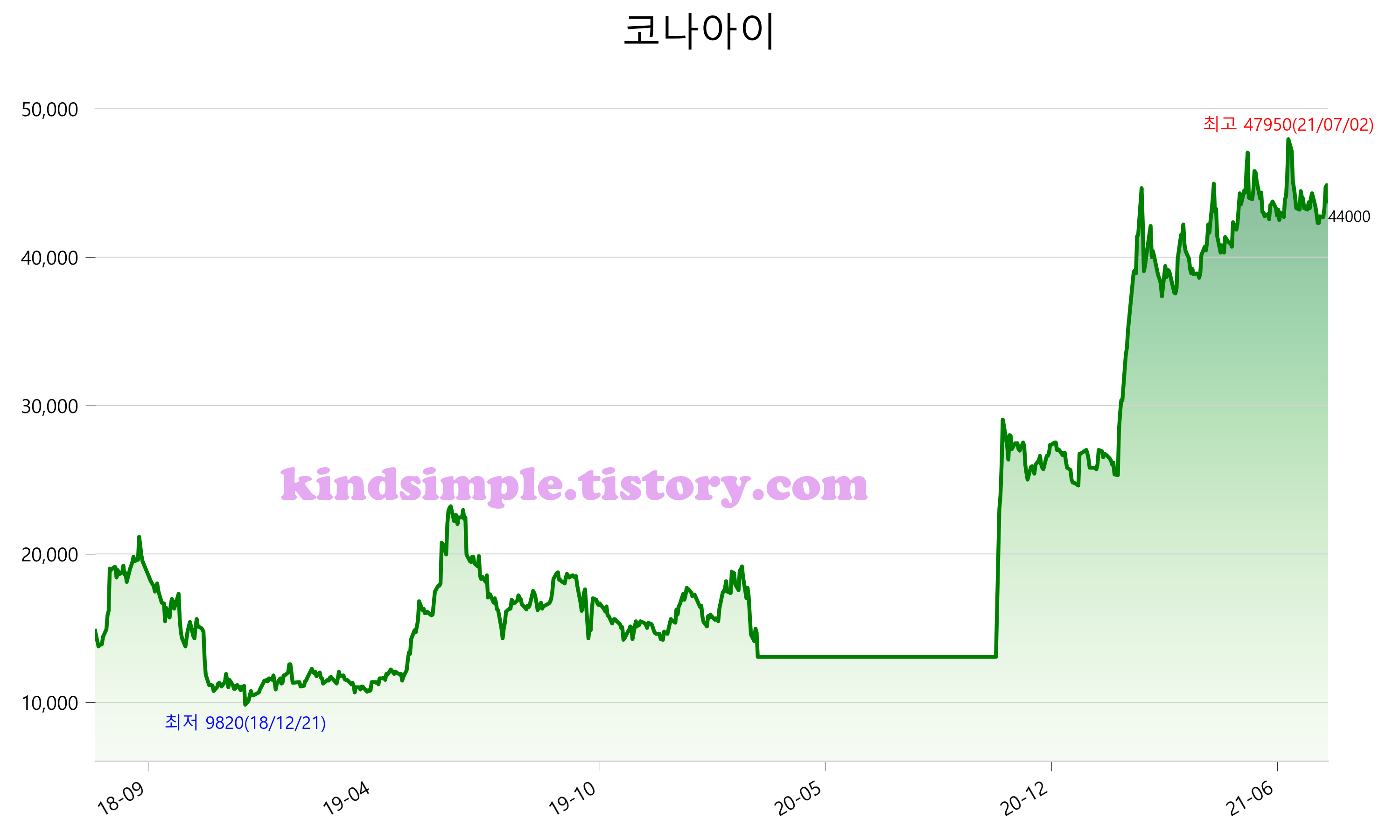 52주 최고가는 47,950원(2021-07-02), 52주 최저가는 13,050원(2020-08-10)으로 52주간 변동률은 237.2% 입니다.