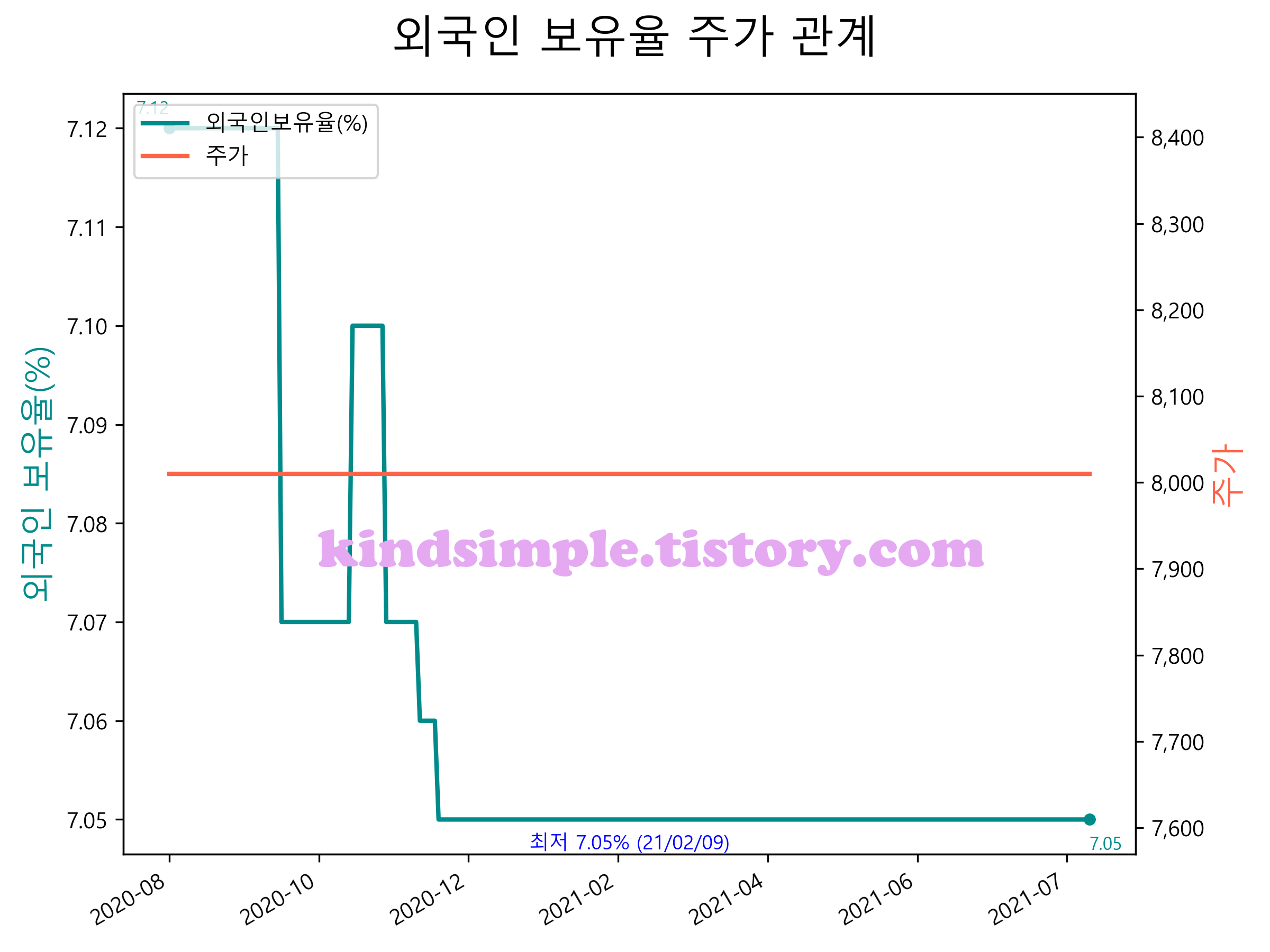 최근 1년간 외국인 보유율 및 주가와의 관계입니다.