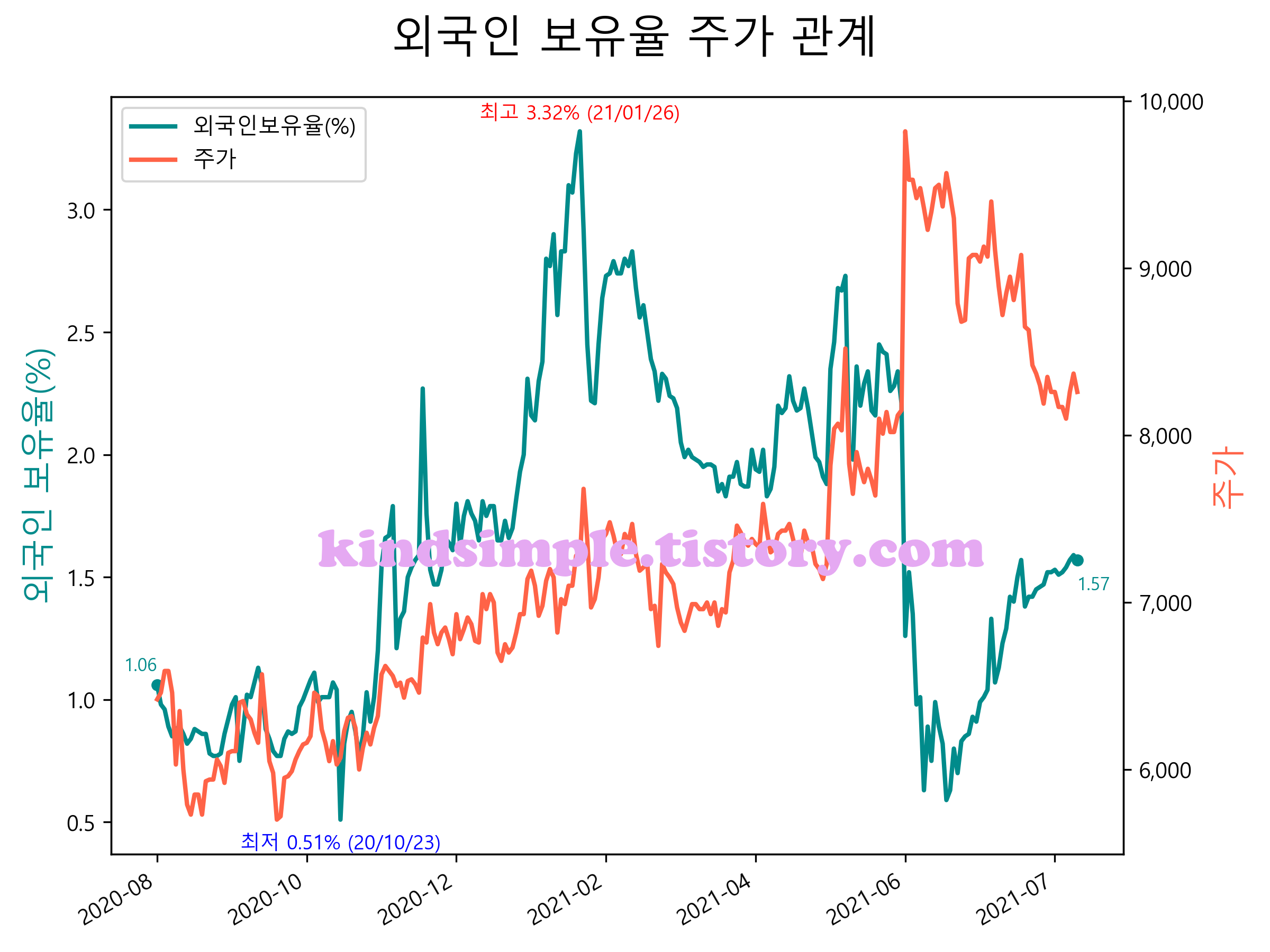 최근 1년간 외국인 보유율 및 주가와의 관계입니다.