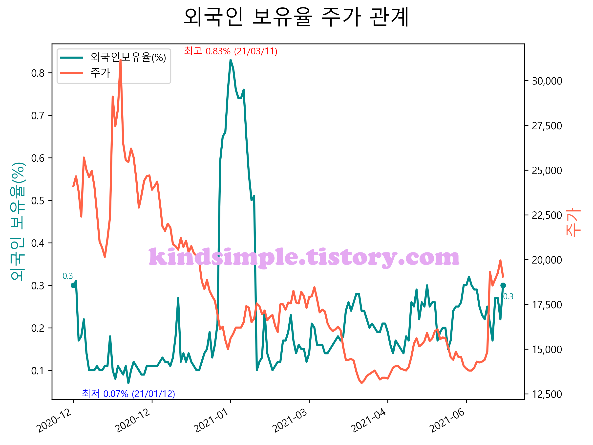 최근 1년간 외국인 보유율 및 주가와의 관계입니다.