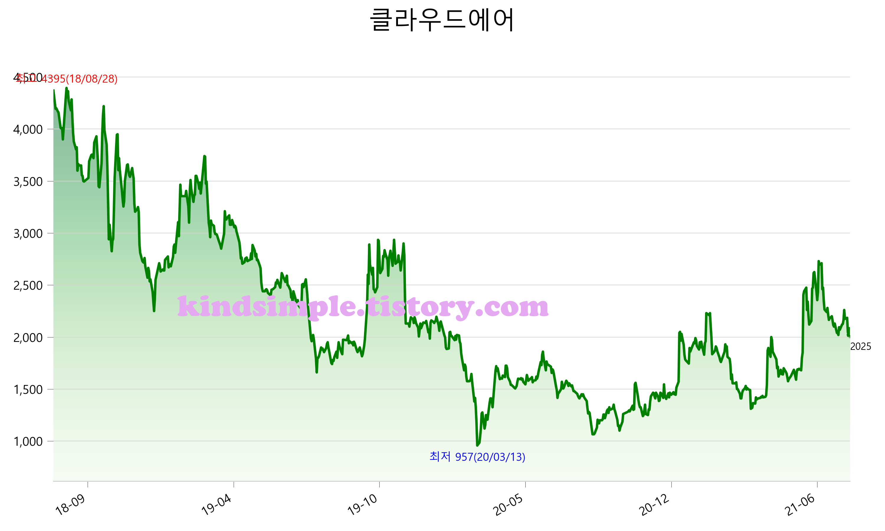 8월 8일 기준 주가는 2,025원 입니다. 아래는 최근 3년간의 주가흐름입니다.