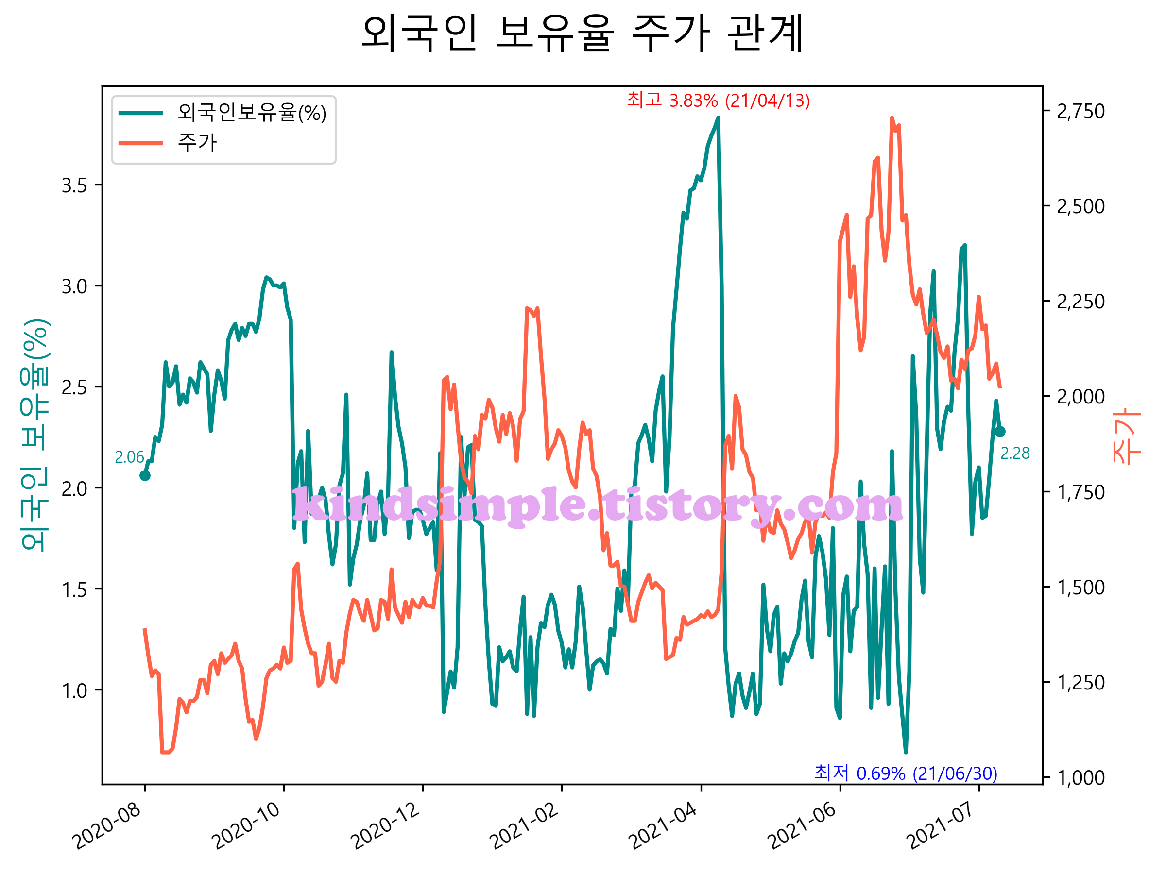 최근 1년간 외국인 보유율 및 주가와의 관계입니다.