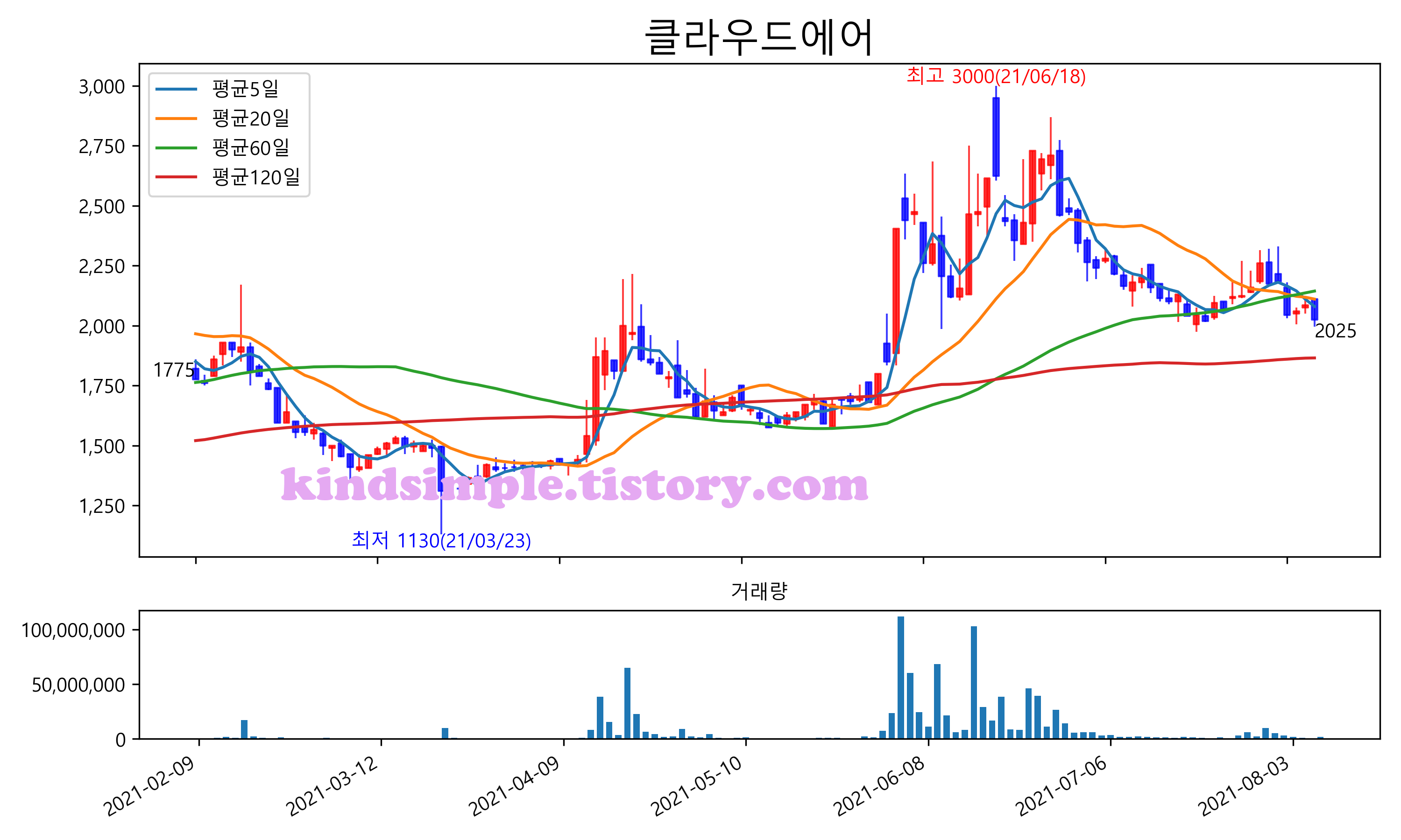 최근 6개월간 캔들차트 및 이동평균선입니다.