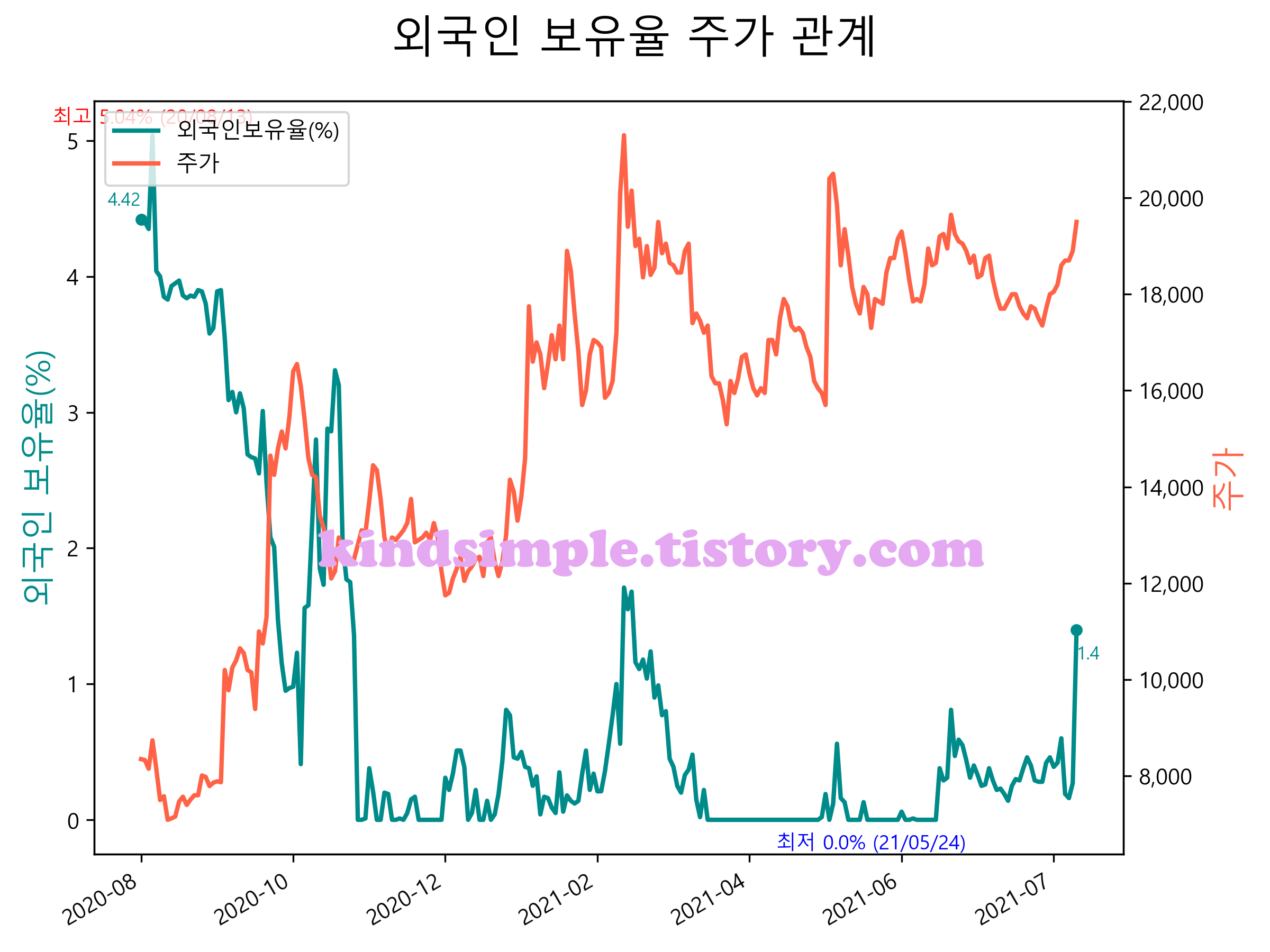 최근 1년간 외국인 보유율 및 주가와의 관계입니다.