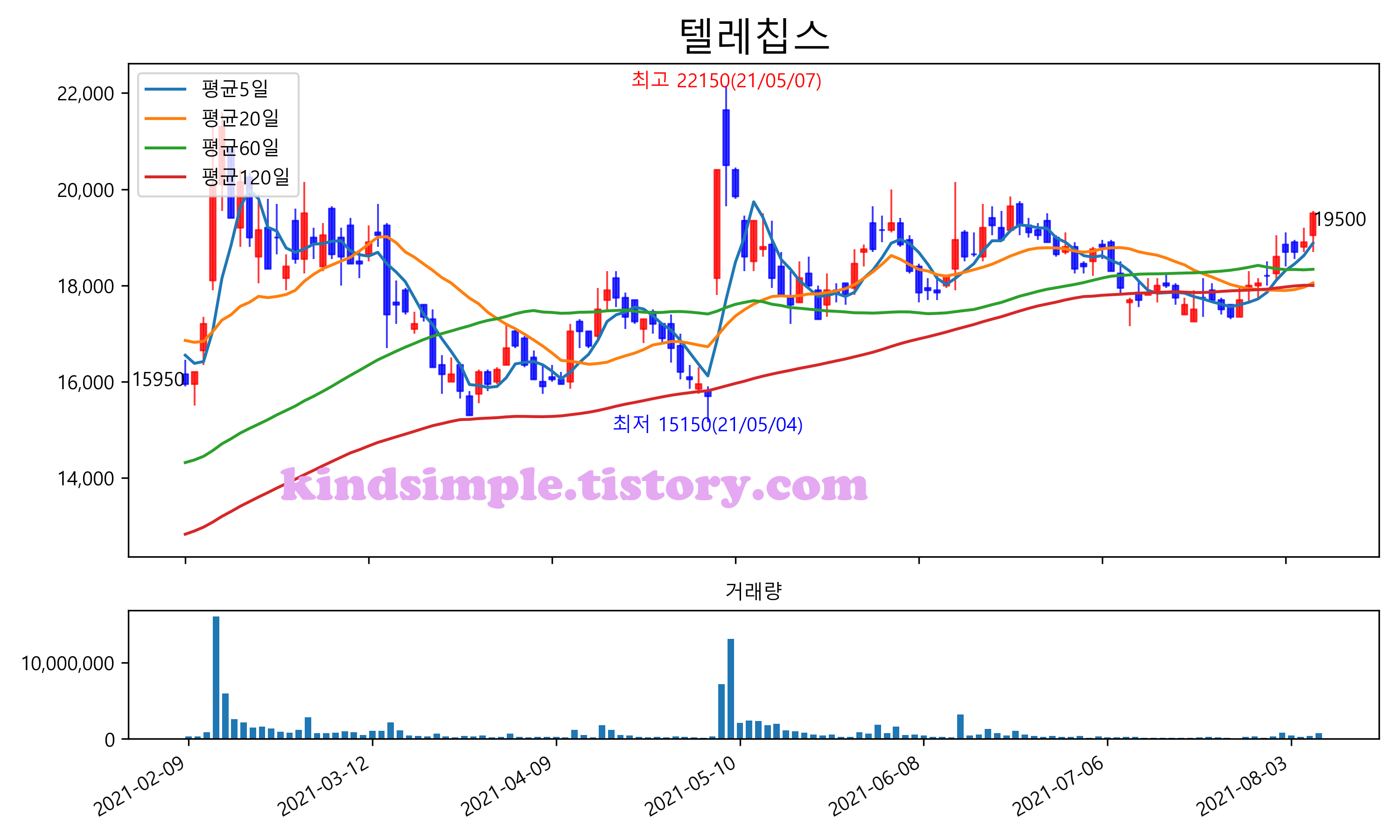 최근 6개월간 캔들차트 및 이동평균선입니다.