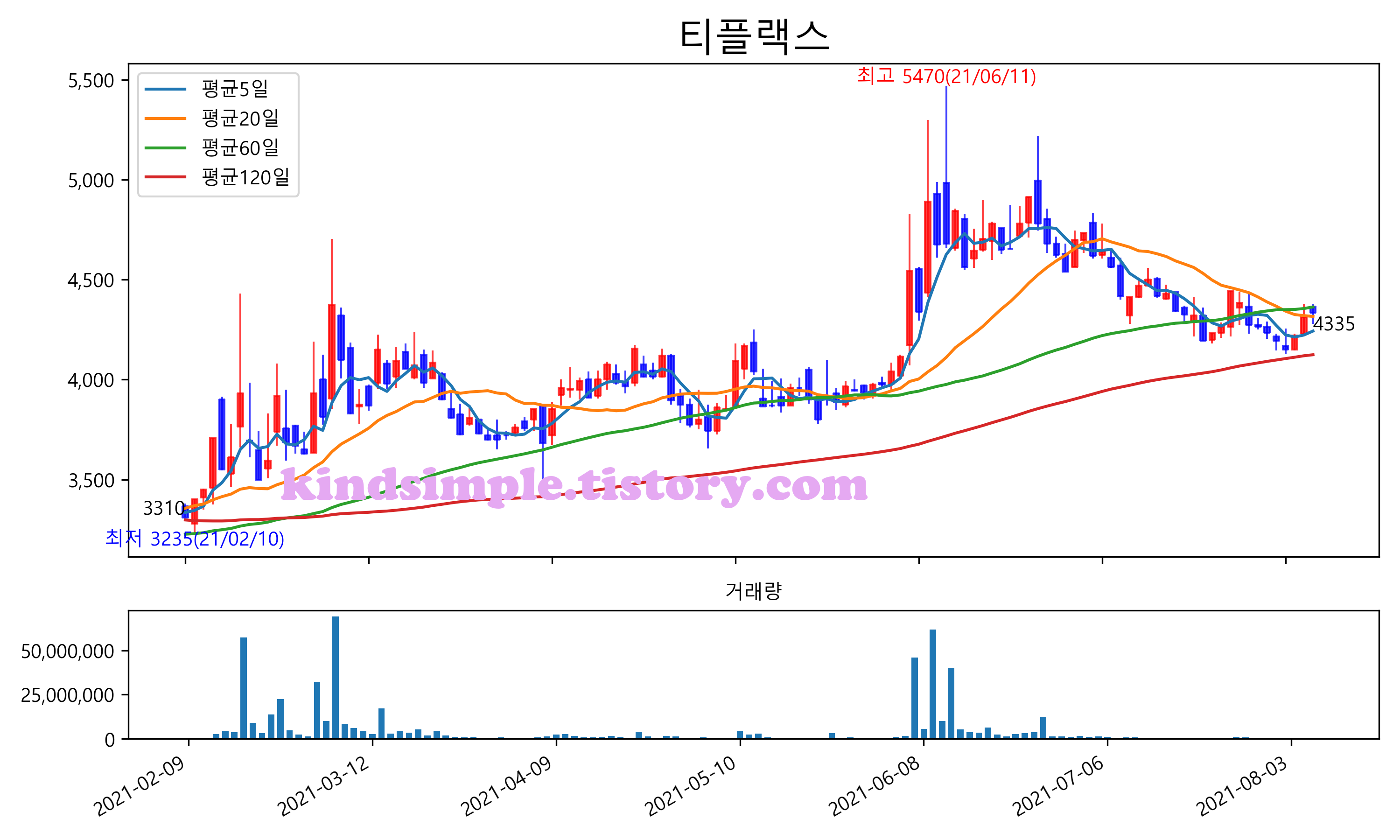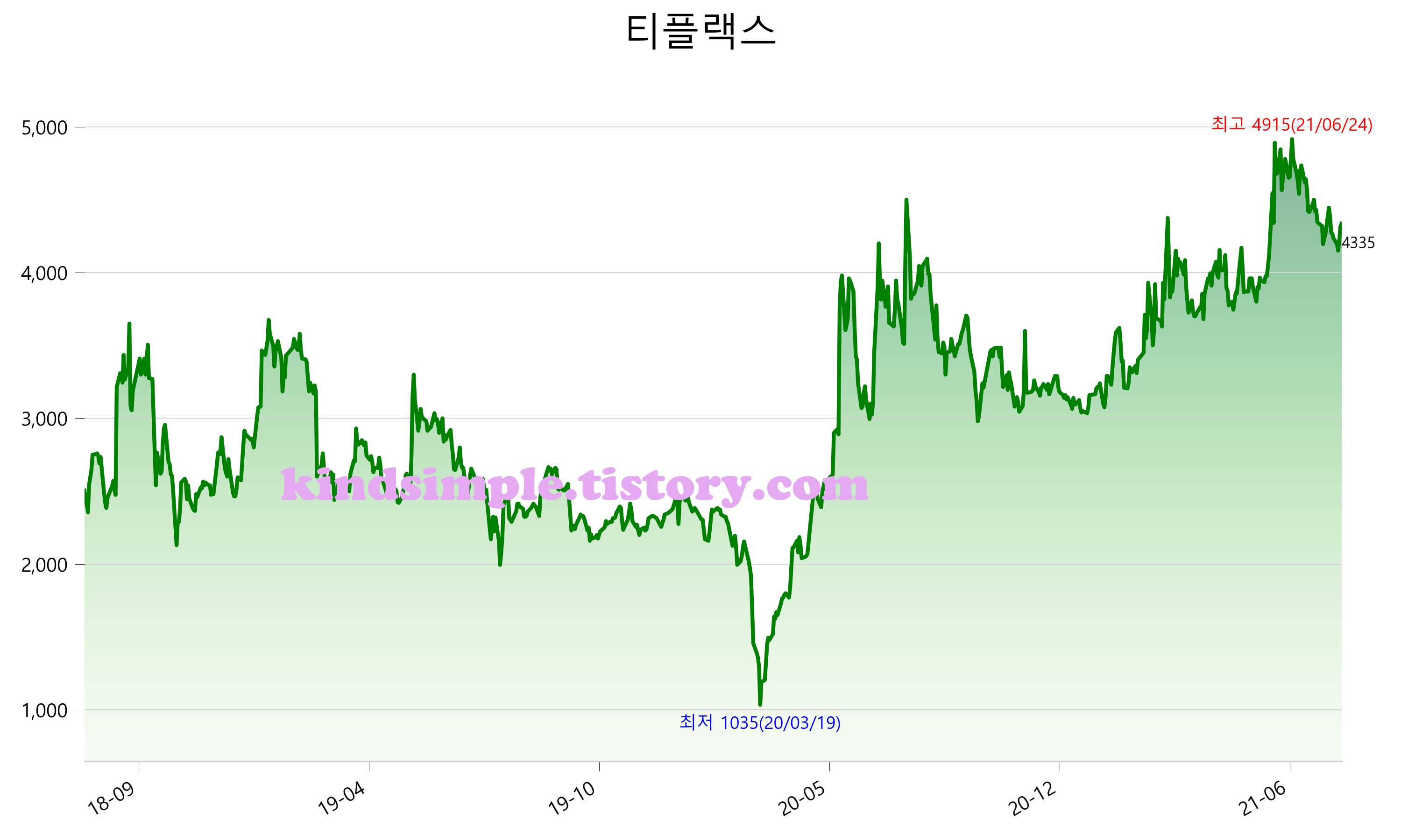 8월 8일 기준 주가는 4,335원 입니다. 아래는 최근 3년간의 주가흐름입니다.