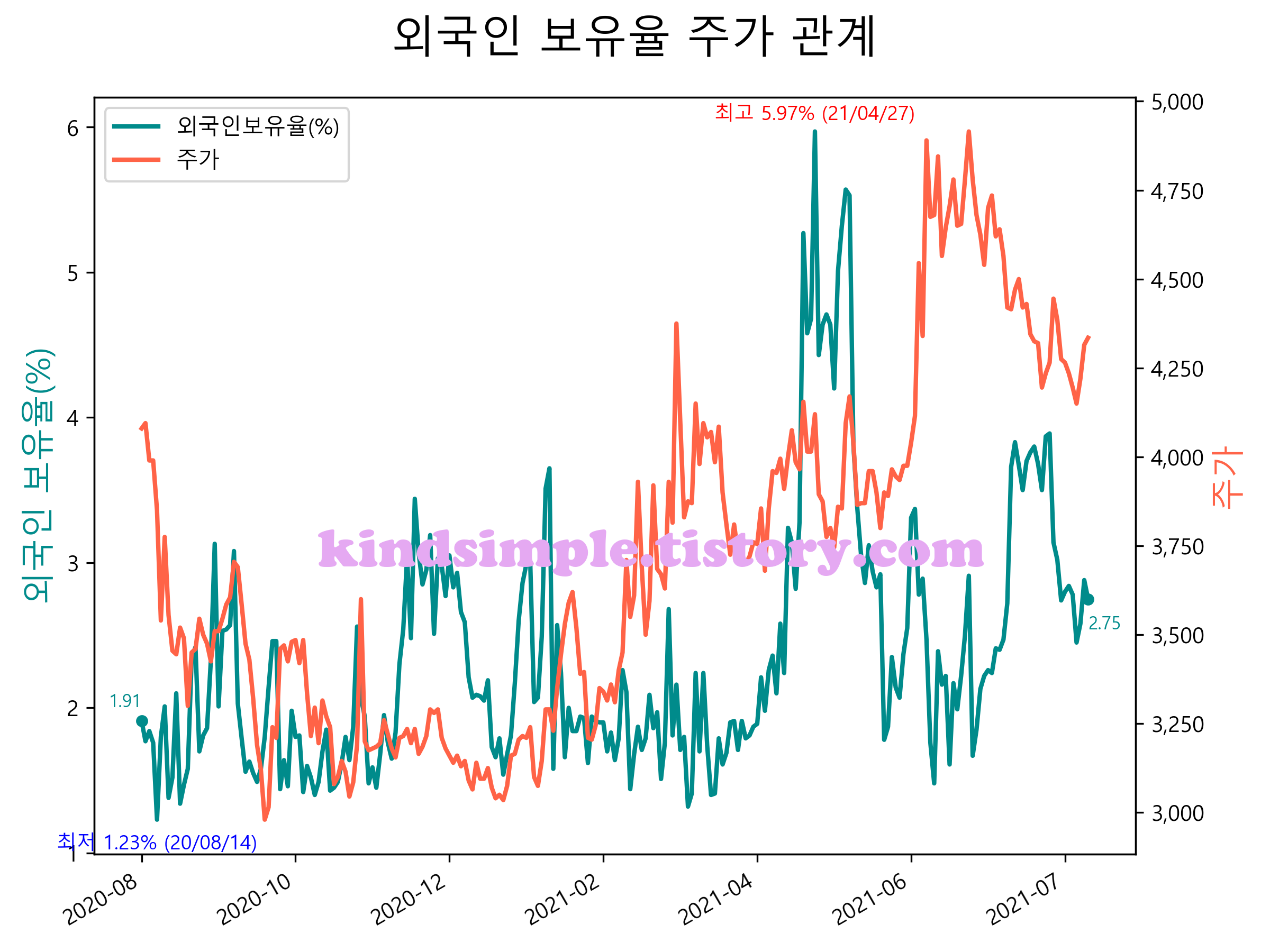 최근 1년간 외국인 보유율 및 주가와의 관계입니다.