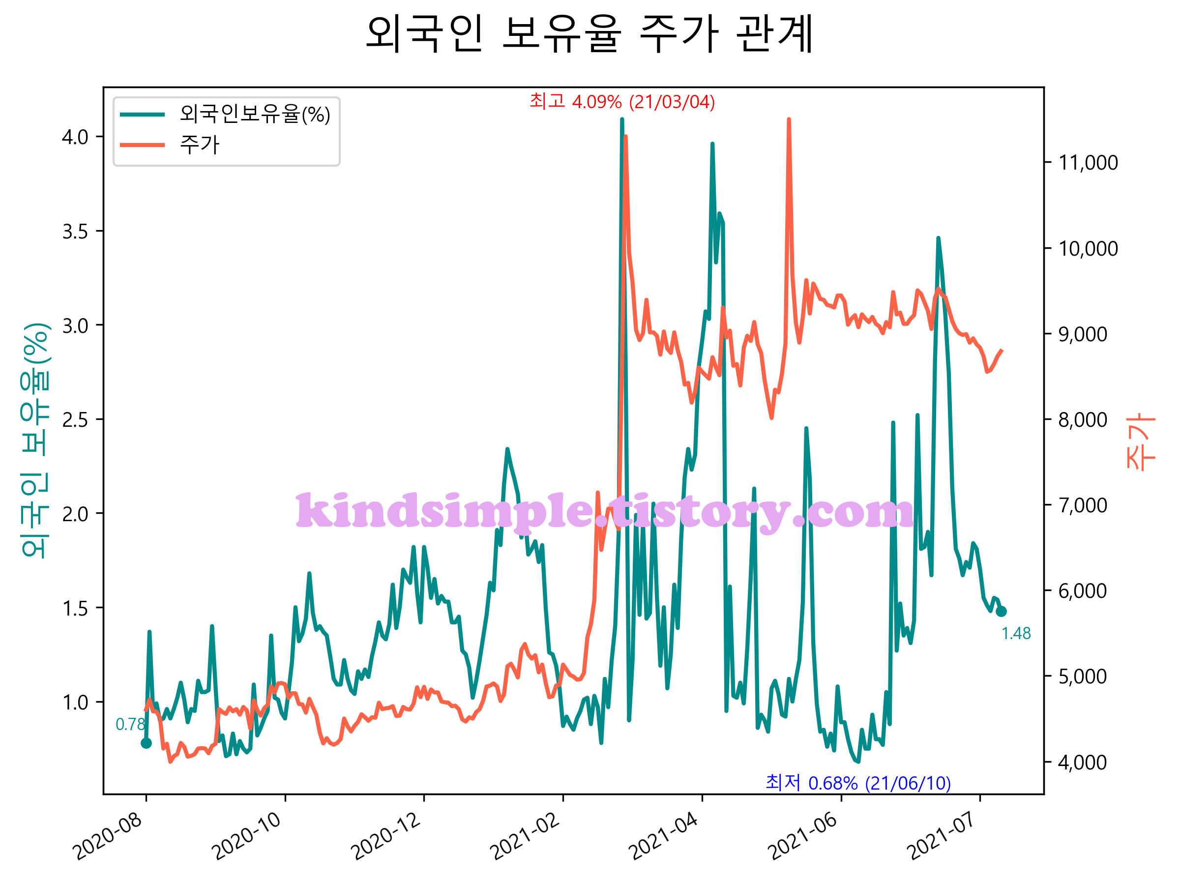 최근 1년간 외국인 보유율 및 주가와의 관계입니다.