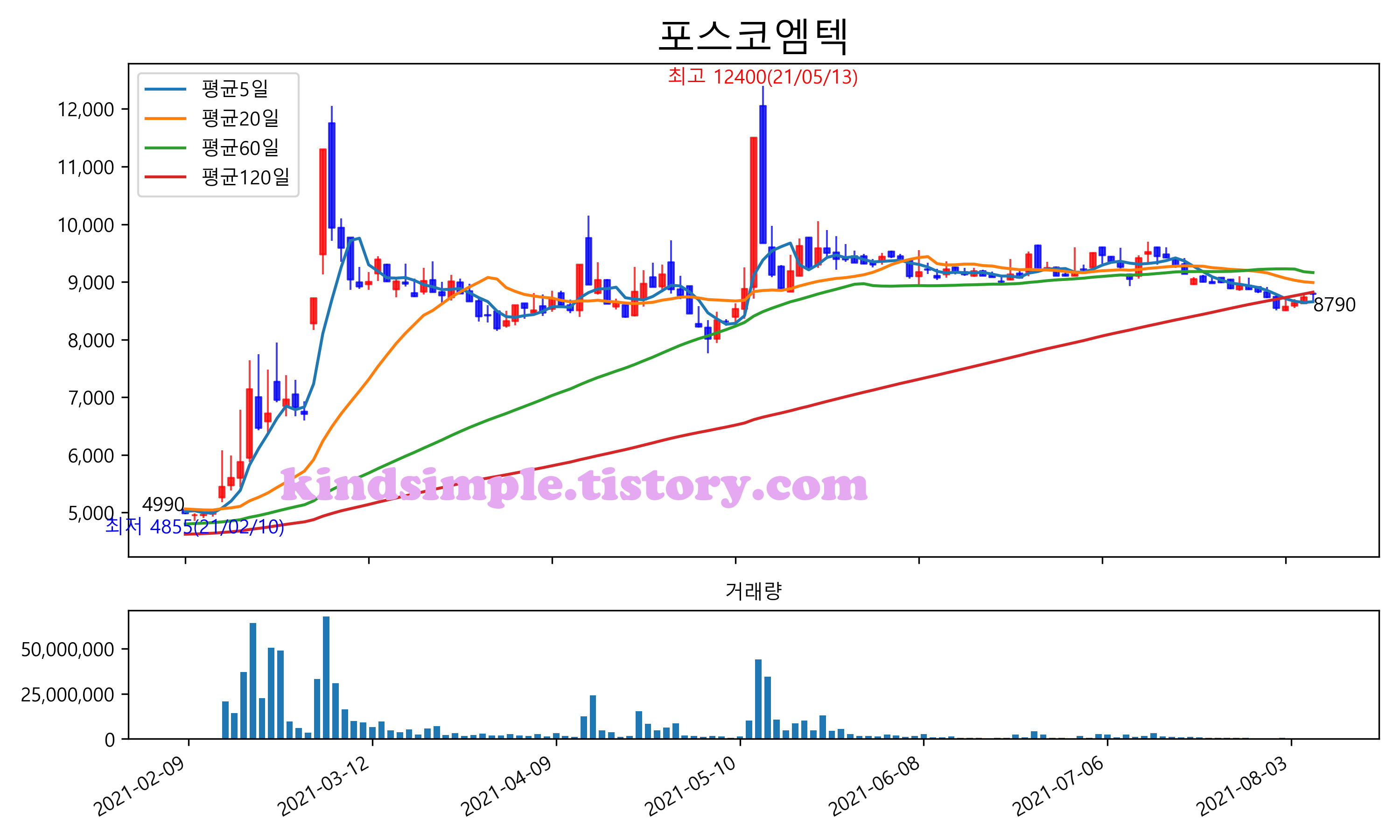 최근 6개월간 캔들차트 및 이동평균선입니다.