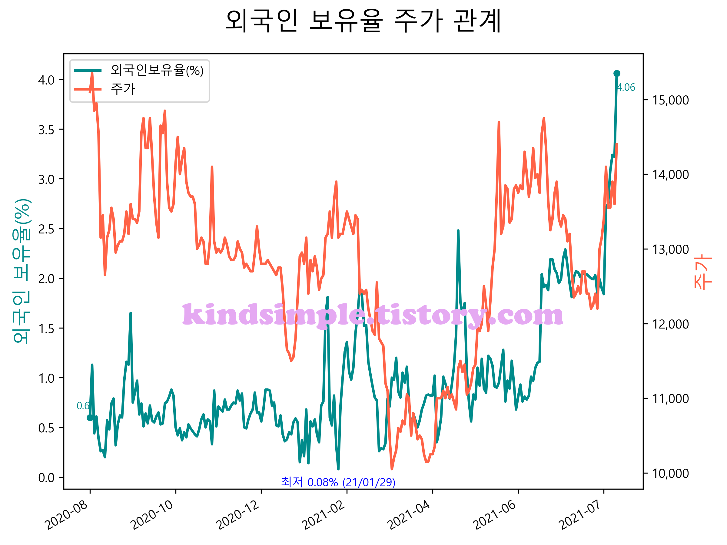 최근 1년간 외국인 보유율 및 주가와의 관계입니다.
