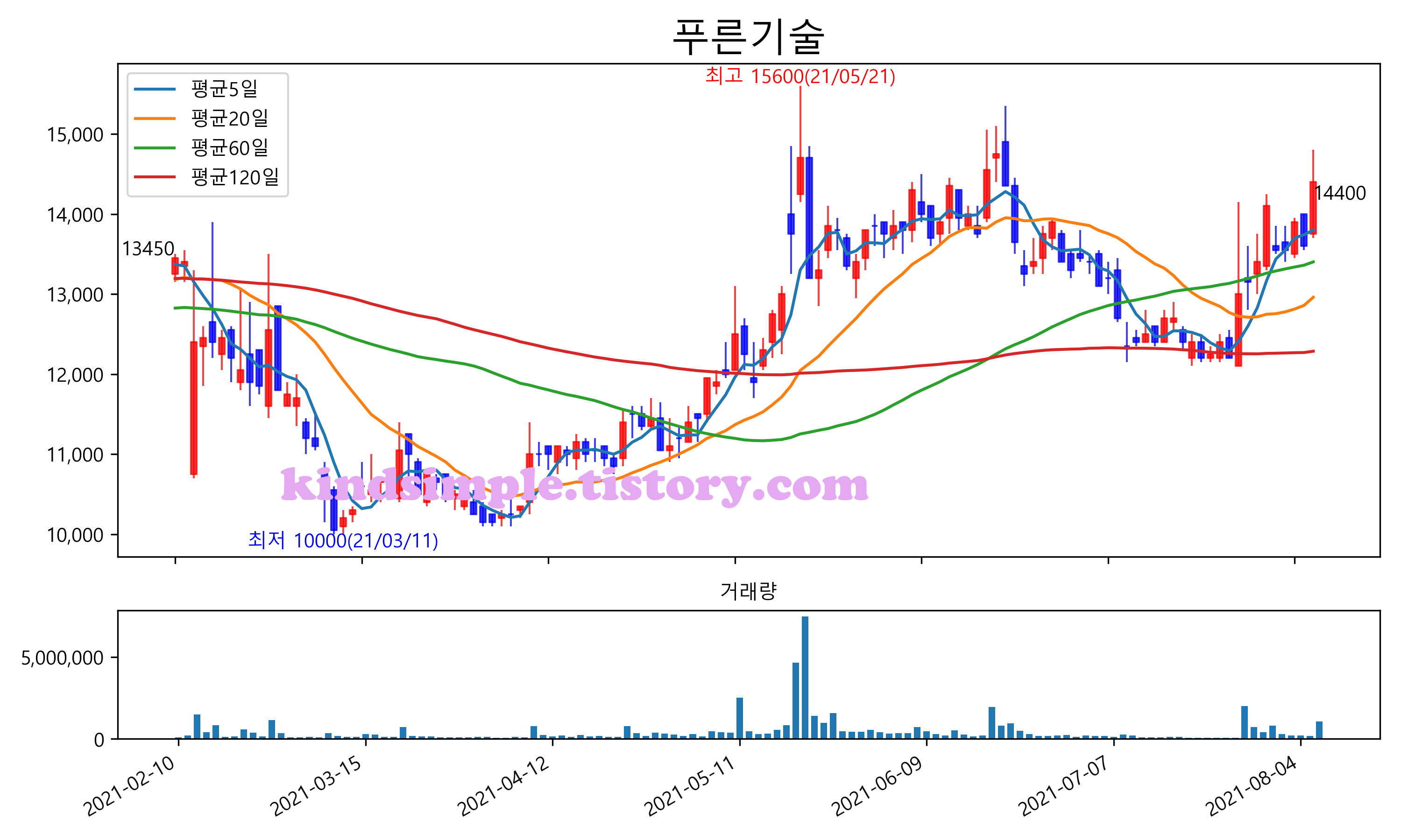 최근 6개월간 캔들차트 및 이동평균선입니다.