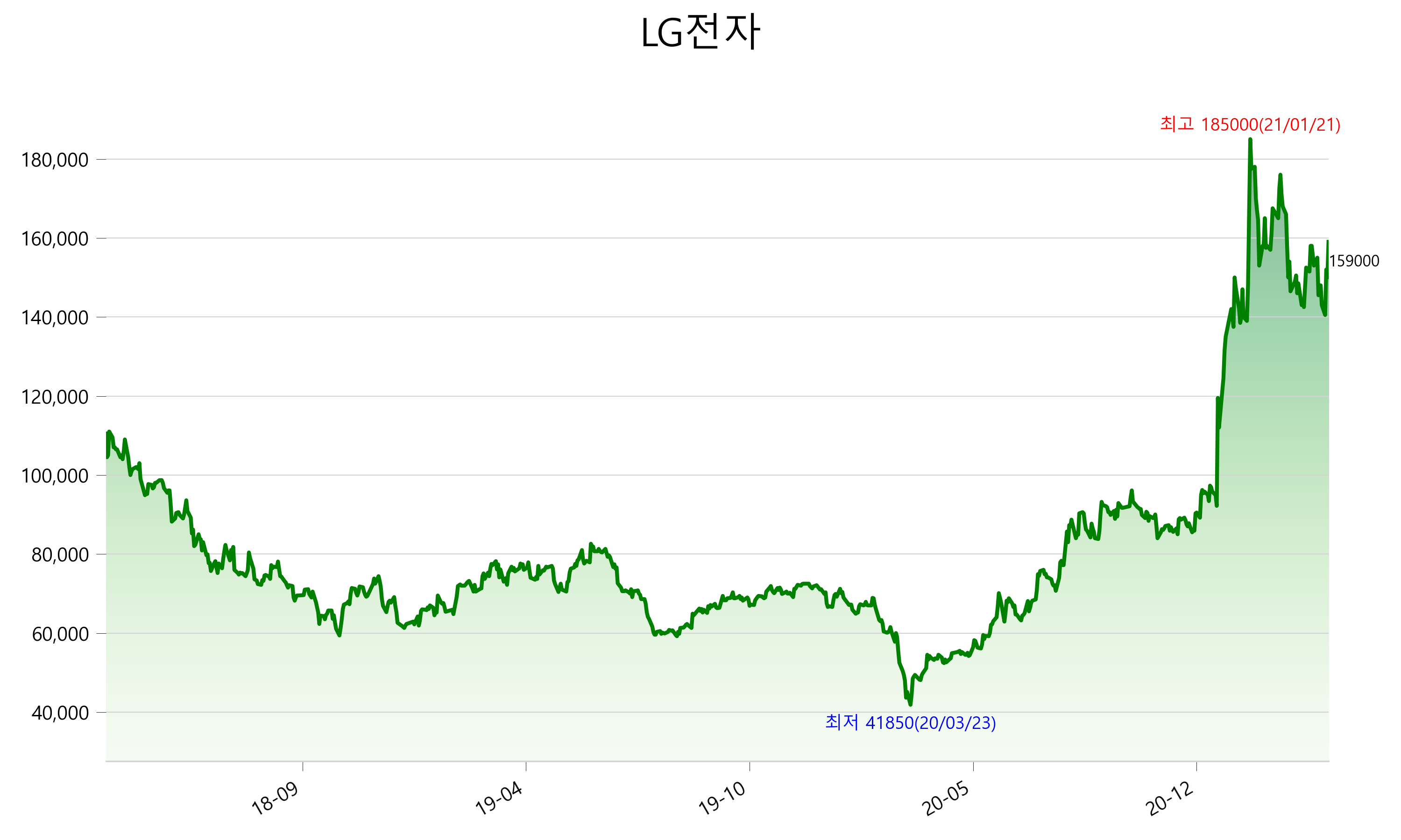 2021년 04월 01일 기준 주가는 159,000원 입니다. 아래는 최근 3년간의 주가흐름입니다.