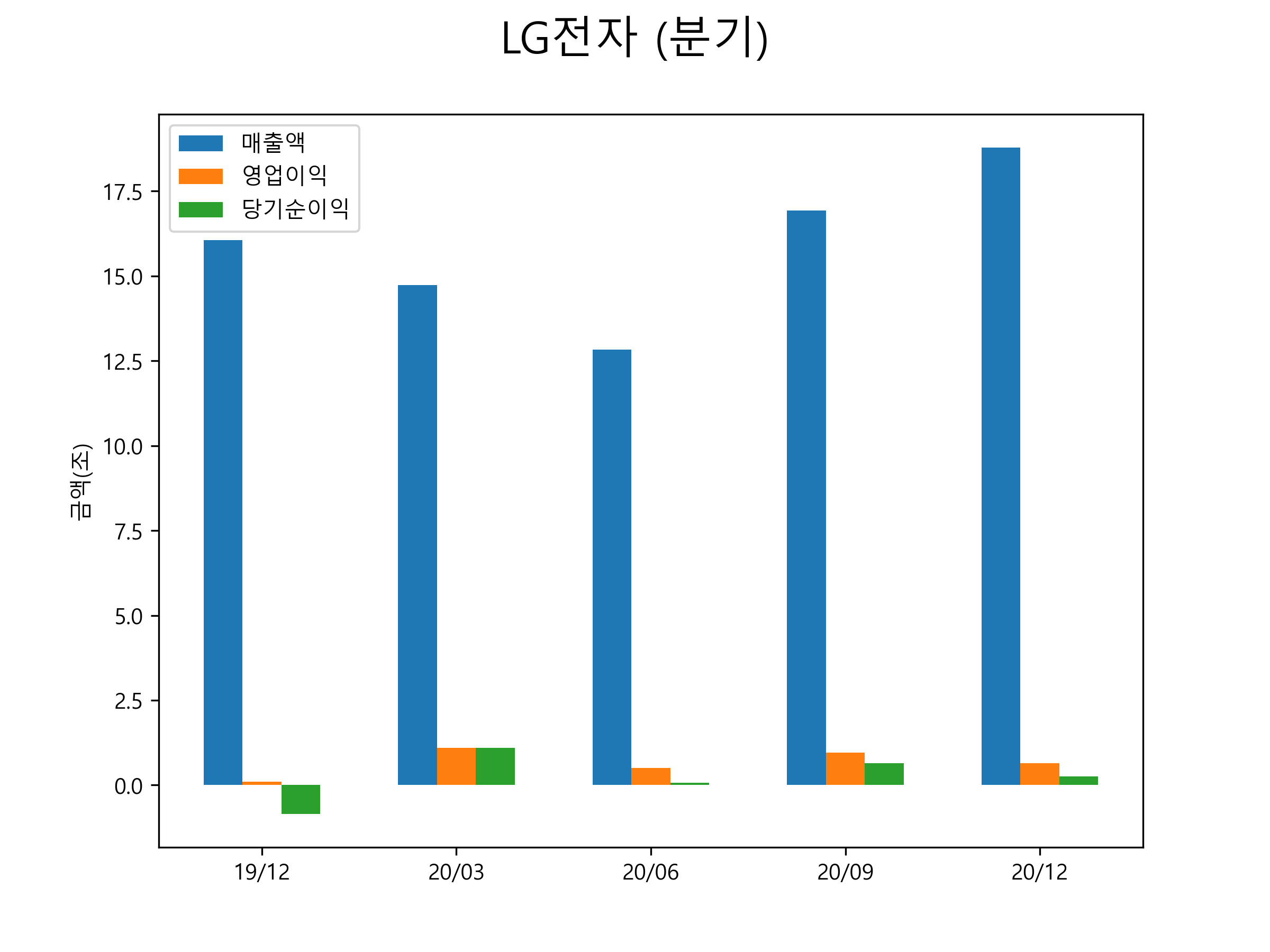 LG전자의 2020년 4분기 매출은 18조 7809억원, 영업이익 6502억원, 당기순이익 2623억원을 기록했습니다. LG전자의 분기별 매출 및 영업이익, 당기순이익 표입니다.