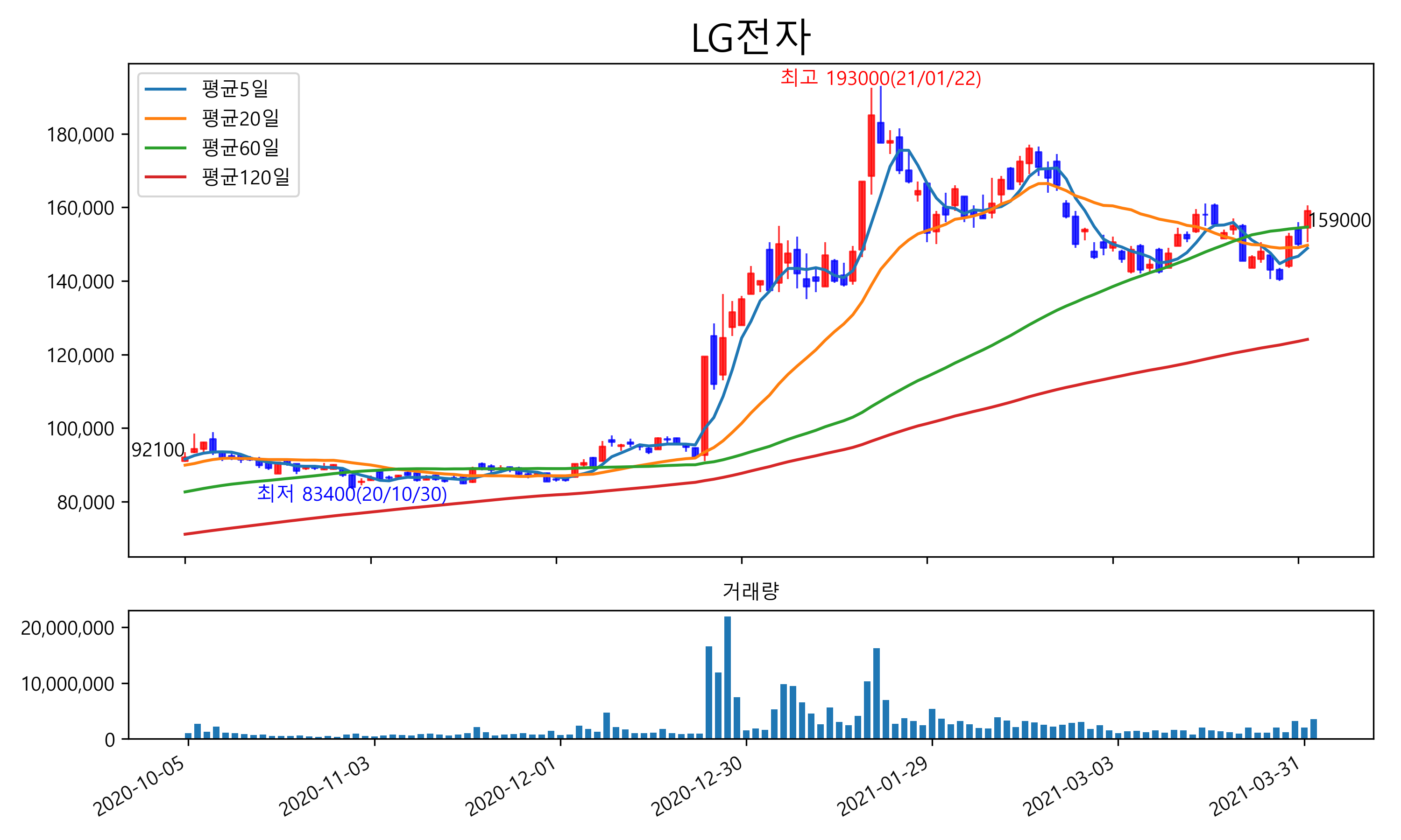최근 6개월간 캔들차트 및 이동평균선입니다.