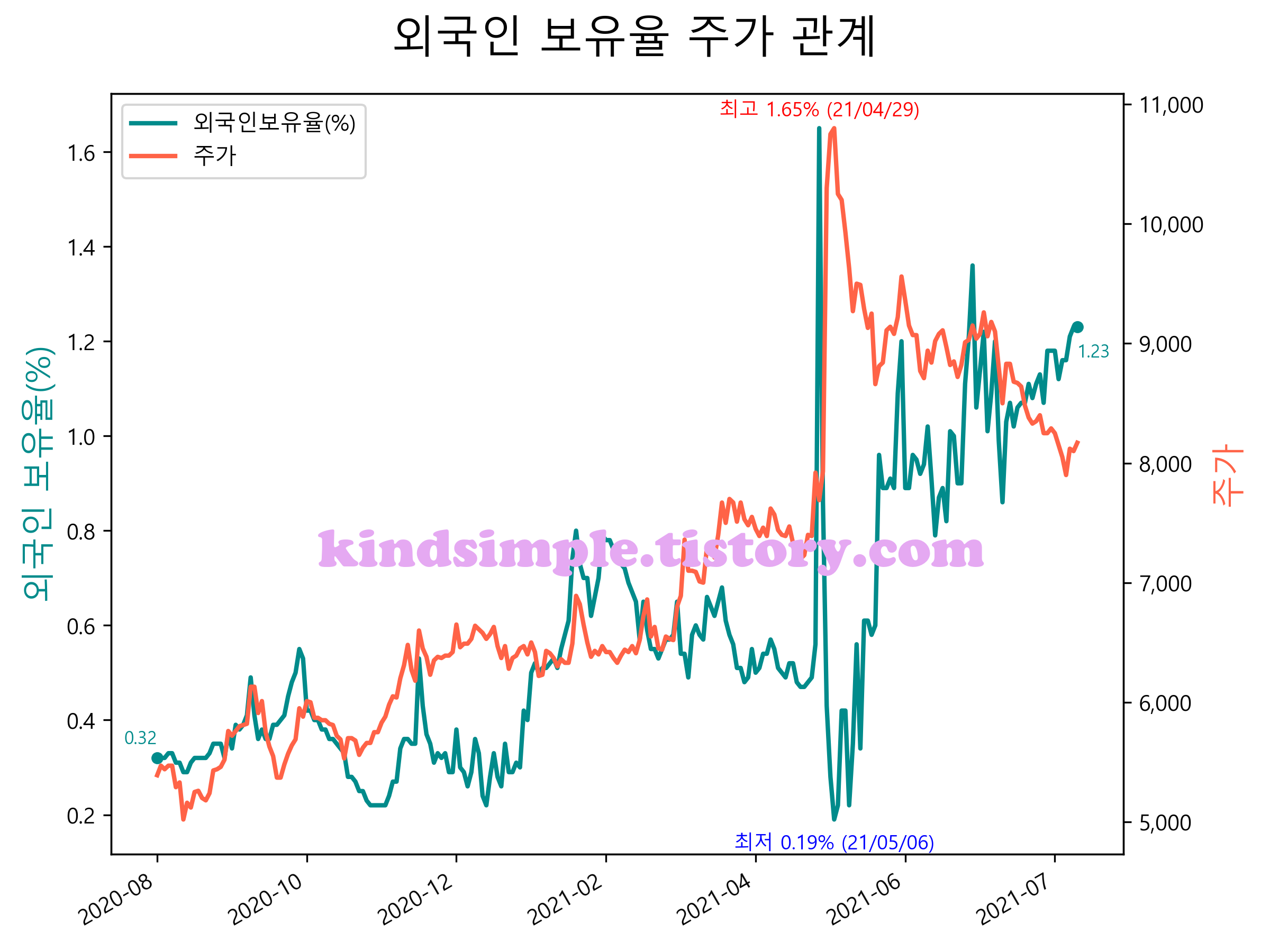 최근 1년간 외국인 보유율 및 주가와의 관계입니다.