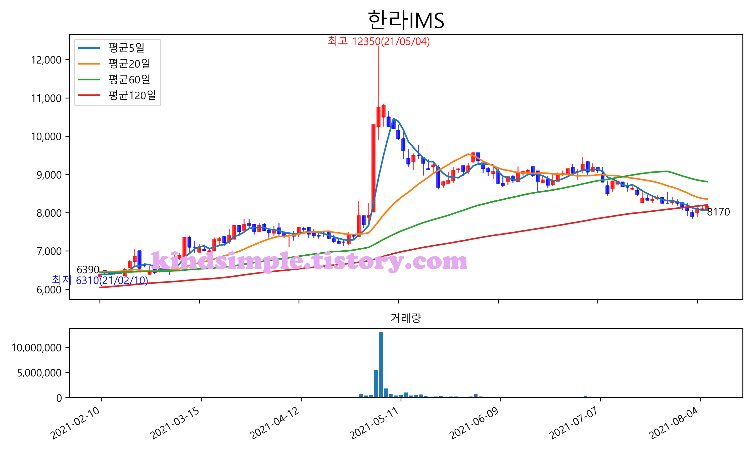 최근 6개월간 캔들차트 및 이동평균선입니다.